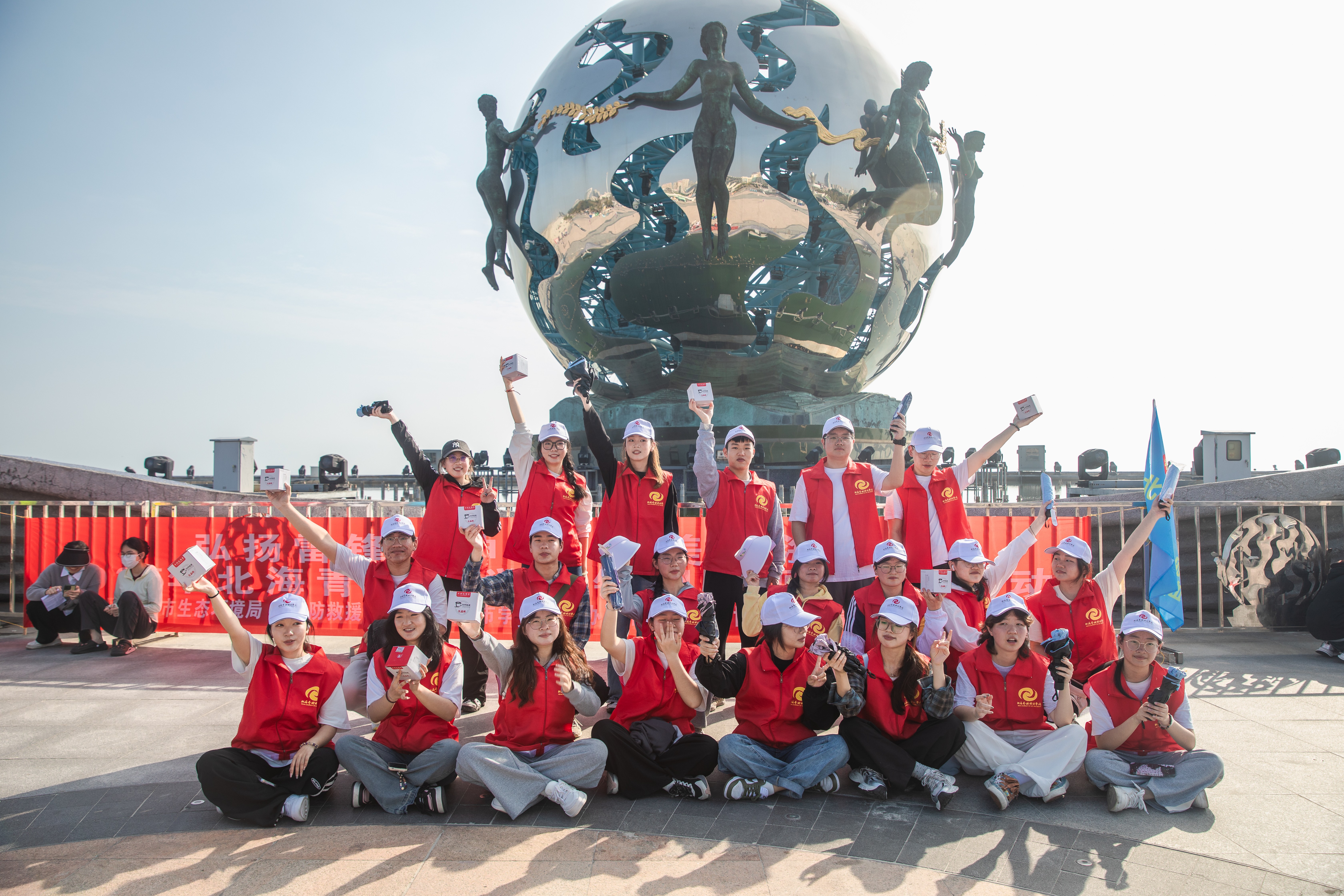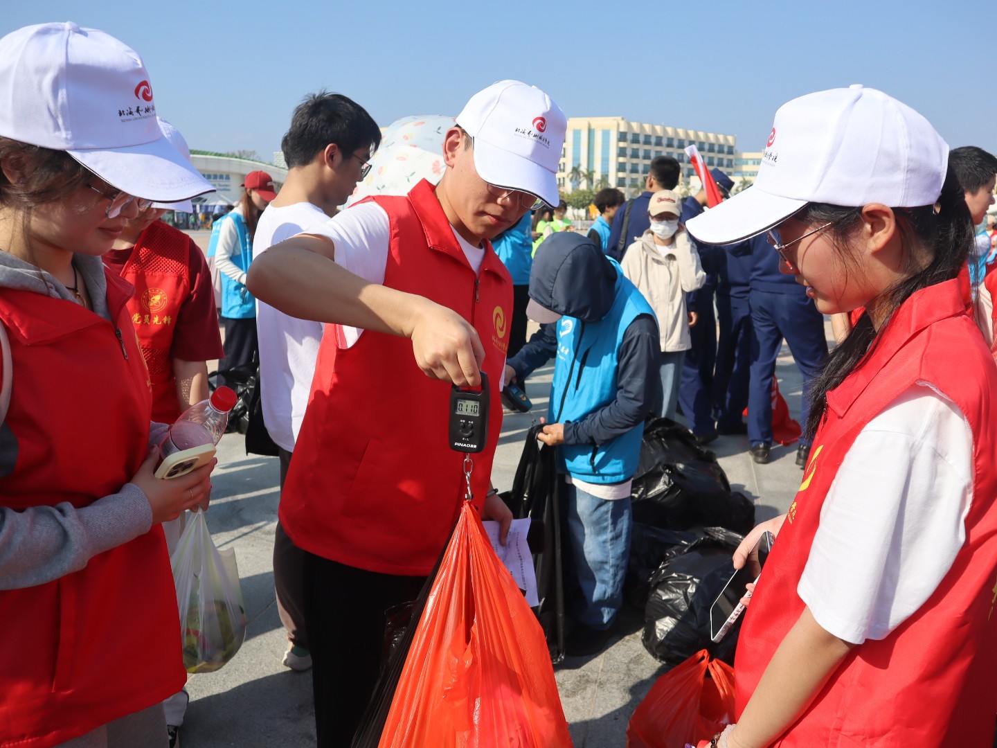 本次活动主办方设计了“分贝值比拼+净滩称重+朋友圈集赞”的积分规则,增添了活动趣味。我校志愿者身着红色志愿者马甲,手持垃圾袋和工具,认真清理沙滩上的烟头、塑料瓶、包装袋等垃圾,滩涂上的“志愿红”成为了一道靓丽的风景线。