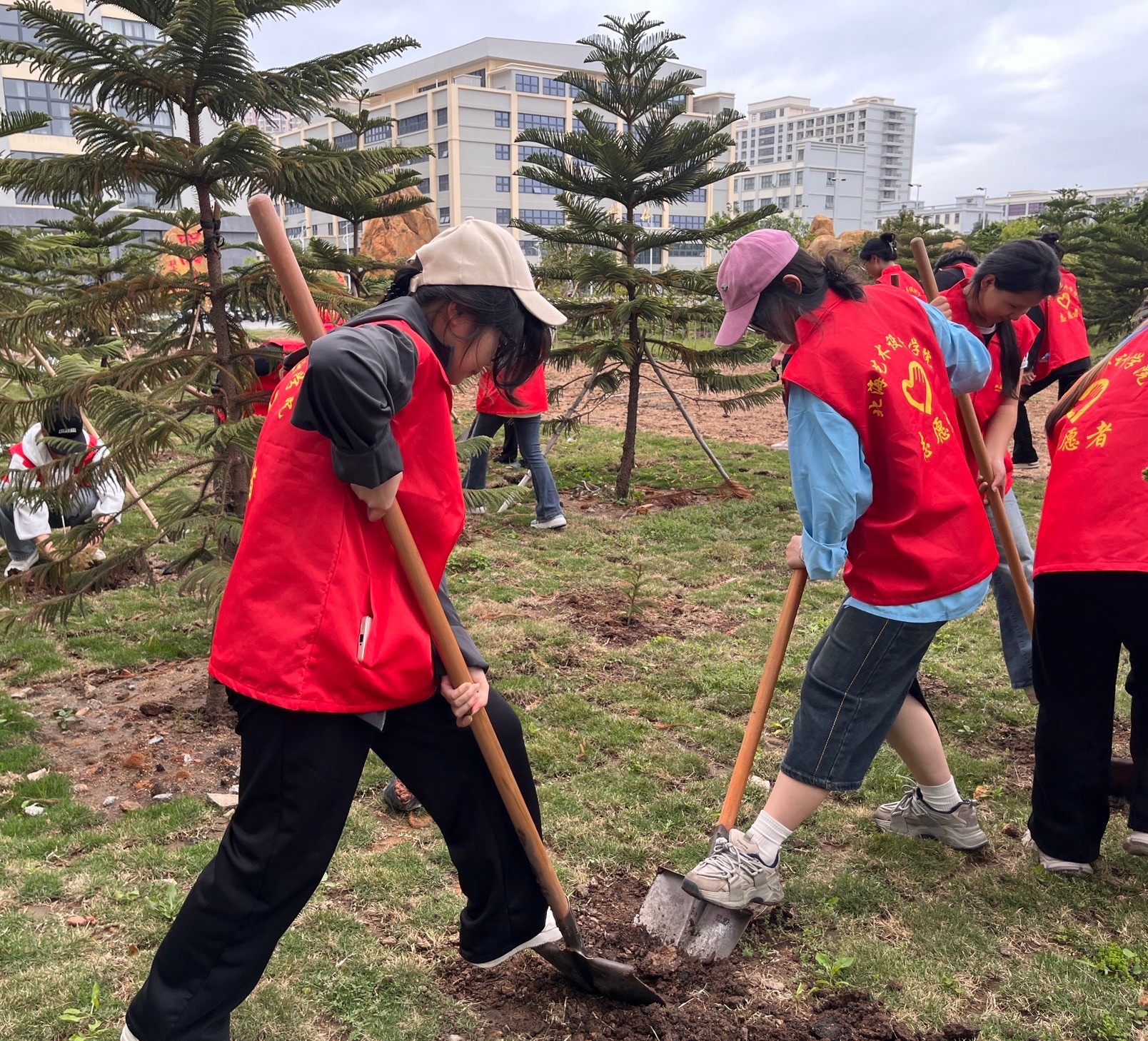 志愿者们怀揣着热情与期待,手持工具迅速投入热火朝天的植树活动中。挥锹挖坑,放苗入坑,小心扶正,填土夯实,提桶浇水,他们分工协作,默契配合,井然有序,合力完成每一道植树工序。