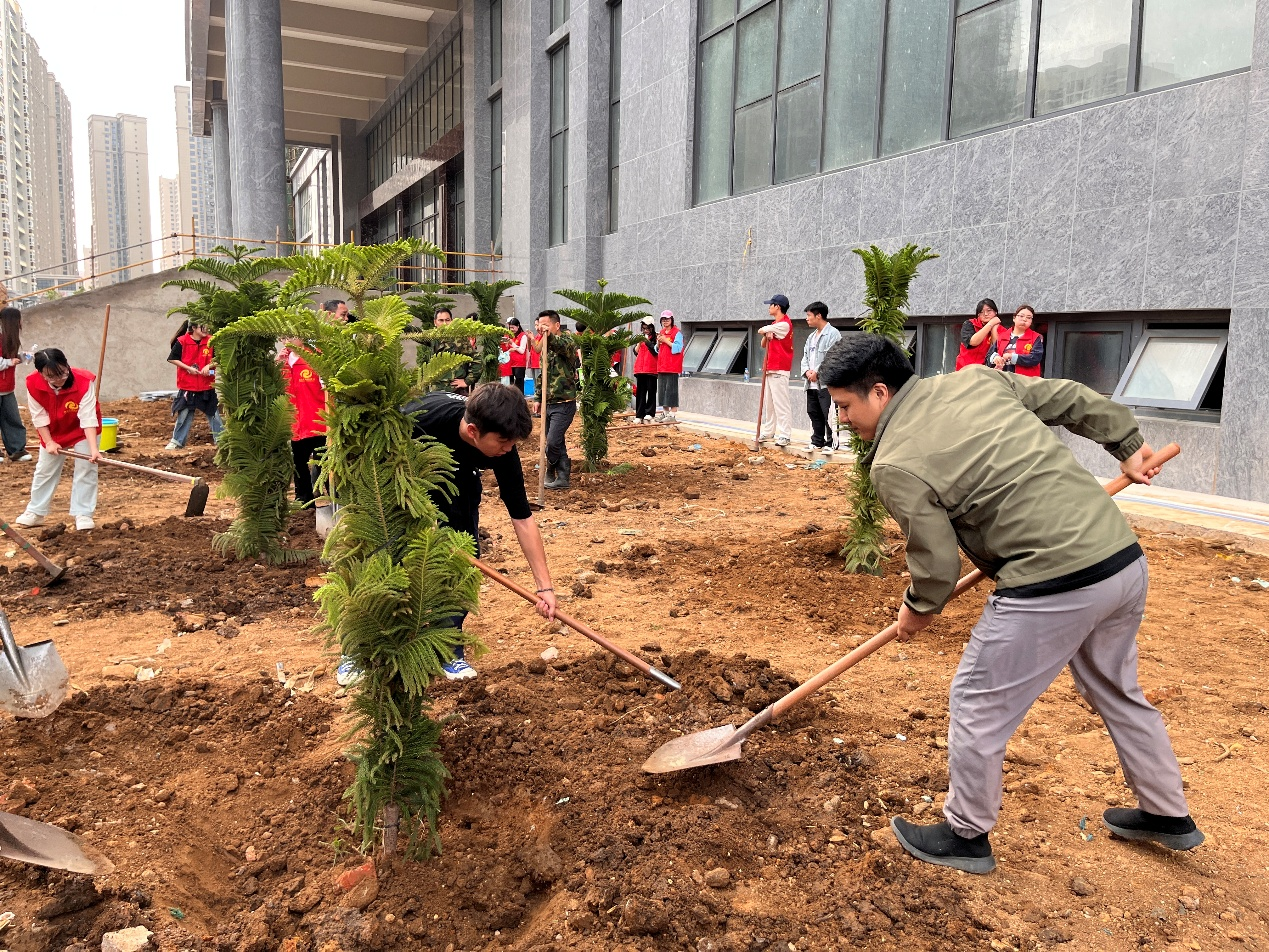 为深入学习贯彻习近平生态文明思想,切实践行“绿水青山就是金山银山”这一理念,坚持人与自然和谐共生,弘扬雷锋精神,增强我校师生绿色环保意识和社会责任感,同时进一步美化校园环境,3月11日,我校团委组织80余名志愿者在南校区开展“凝心聚‘绿’,青年先行”植树节活动。
