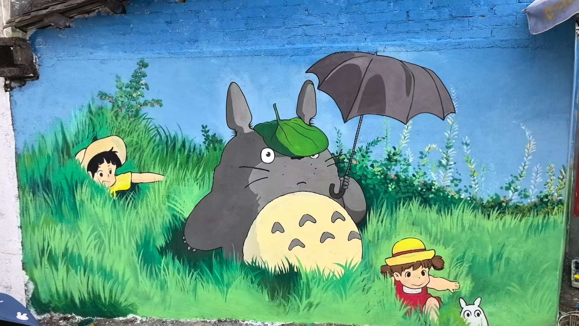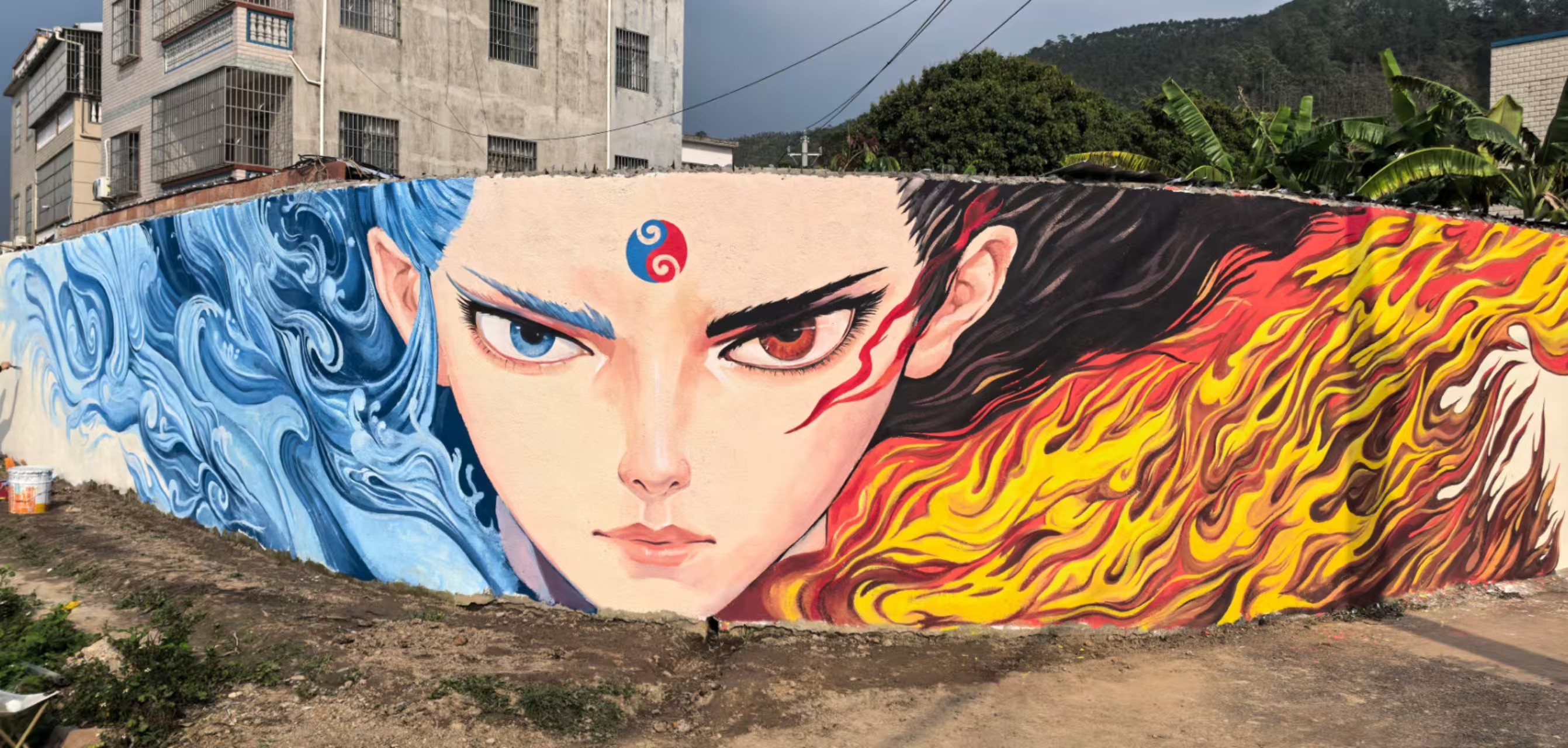 本作品以当下爆火的动漫哪吒为核心形象,巧妙融入水火元素,采用水彩墙绘形式创作而成。画面生动活泼、富有朝气,以年轻化、大众化的艺术表达走进乡村,既美化乡村环境、改善乡村风貌,又以鲜活的文化符号丰富村民精神文化生活,让艺术赋能乡村,传递积极向上的精神力量。