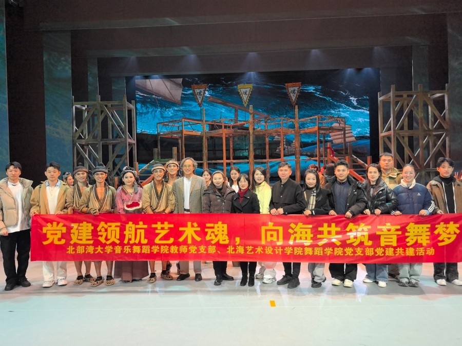 当天,我校舞蹈学院师生与北部湾大学党员教师代表还共同观看了国家艺术基金资助的精品舞剧《大浪千帆》,并亲切慰问了参演的两校校友。舞剧演出结束后,北海艺术设计学院校长卢新华与北部湾大学调研组一行上台,与两校参演校友合影留念,为本次共建活动画上圆满句号。北海艺术设计学院党委宣传部部长文春明、舞蹈学院党支部书记宋慧敏,北部湾大学派驻共建工作队成员古雅峰、刘承参与此次共建活动。