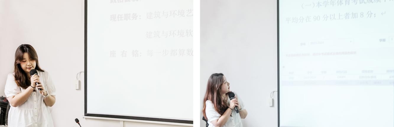 邀请的第二位学姐是来自建环学院环境设计专业的李未学姐,学姐给大家分享了学习专业知识的网站,传授自己的学习经验,以及提高学习成绩方法。以亲身经历激励同学们积极的参与校内外各项竞赛与实践活动,她激情的演讲激励了新生们。