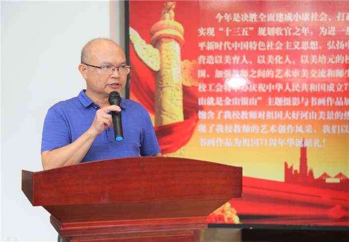 2020年 9月30日上午,由学校工会主办的庆祝中华人民共和国成立71周年“绿水青山就是金山银山”主题摄影与书画艺术展在西校区图书馆一楼正厅开幕。学校党委书记李高南,特邀嘉宾北海画院院长李光琳,特邀嘉宾北海国学院刘阳奎老师,学校副校长张建虹、张跃、胡胜、王斌、邱杰及二级学院领导出开幕仪式。工会常务副主席韩传杰主持开幕仪式。