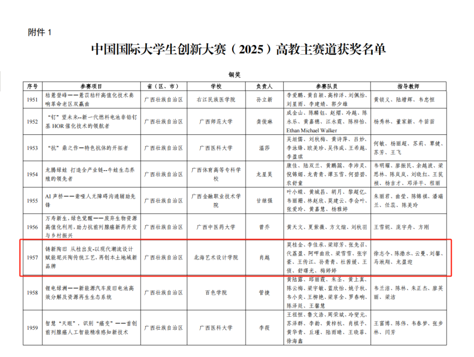 近日,教育部印发《关于公布中国国际大学生创新大赛(2025)获奖名单的通知》(教高函〔2026〕1号)正式公布了获奖结果。我校学生团队项目《铸新陶旧 从桂出发—以现代潮流设计赋能坭兴陶传统工艺,再创本土地域新品牌》凭借扎实的实践基础、新颖的创新理念和鲜明的本土特色,在全国5673所学校、619万个参赛项目中脱颖而出,喜获国家级铜奖。