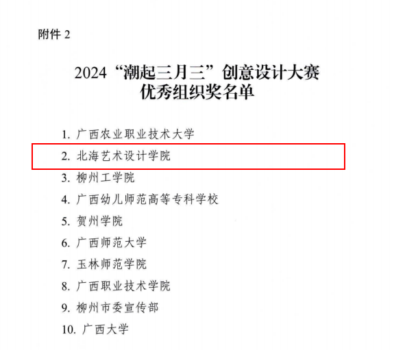 近日,由自治区党委宣传部、自治区教育厅、自治区文化和旅游厅联合举办的2024“潮起三月三”创意设计大赛公布了获奖名单,我校有《华彩丝路》、《三月谣音乐节》《北海老街系列牙签盒》3项作品荣获评委会提名奖。此外,北海艺术设计学院也荣获了优秀组织奖。