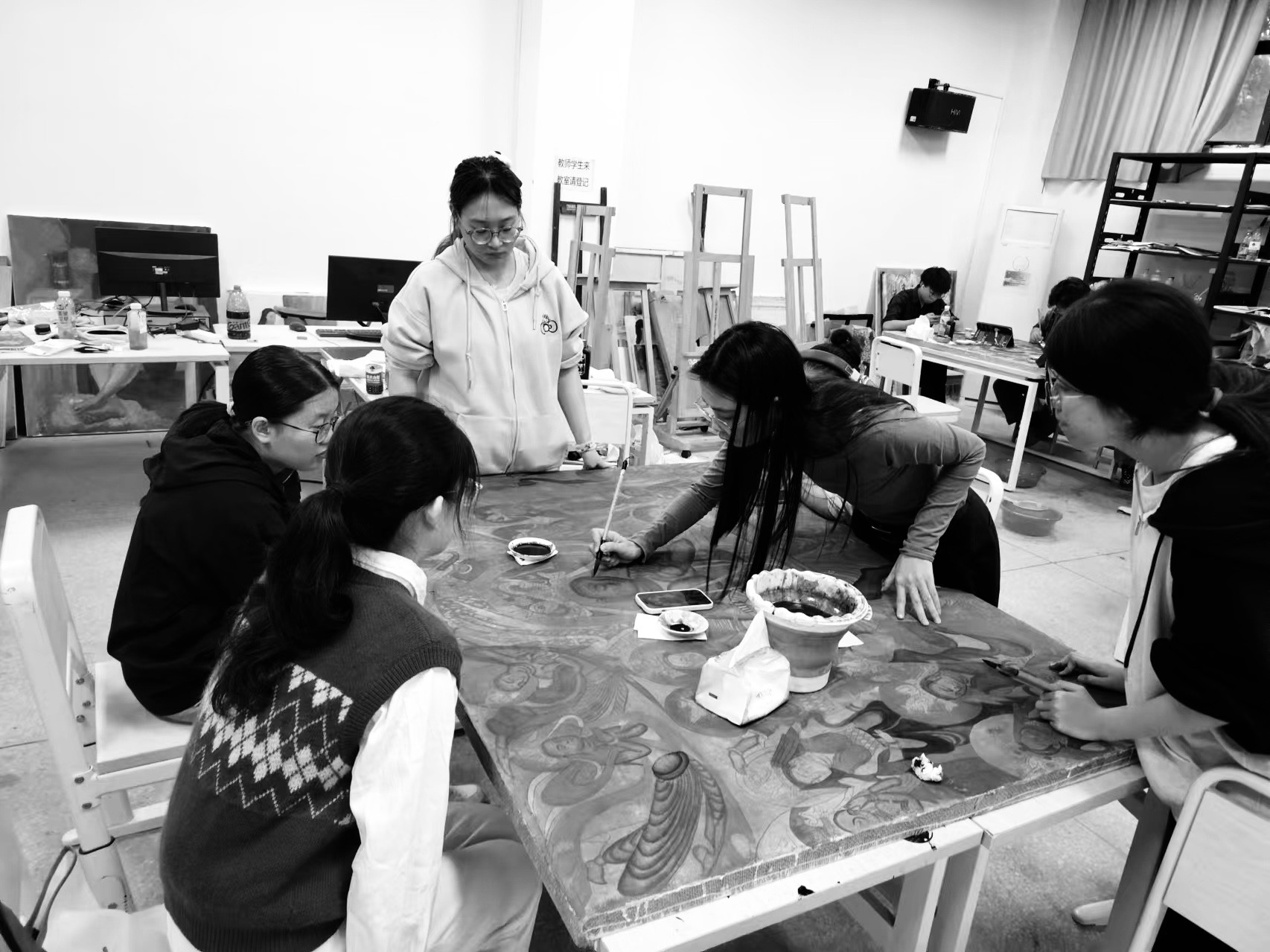 《中国传统壁画临摹》是面向美术学院学生的专业拓展课,以理论和实践相结合的方式,初步认识敦煌壁画的经典遗存。课程从莫高窟的历史背景、文化内涵和壁画故事文本的梳理,在理论上对敦煌壁画构建出一个立体的认识。要求学生绘制中严格按照传统壁画的绘制流程,体会古代画师对壁画工艺的尊重与严谨。建议学生按小组结合完成整铺壁画的临摹,感受壁画独特的图像叙事逻辑,也可个人选取局部进行现状临摹。临摹过程中体会矿物材料的特性、美感,并分析经过时间洗礼后的壁画色彩的承接关系等。鼓励来自不同专业的同学发挥自身艺术能动性,在实践中体会传统壁画与本专业绘画的异同,激发自身的创造性,为日后的创作提供更多的可能性。