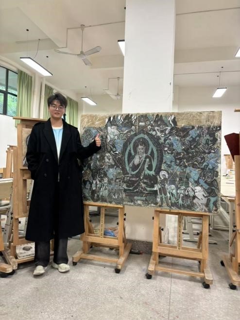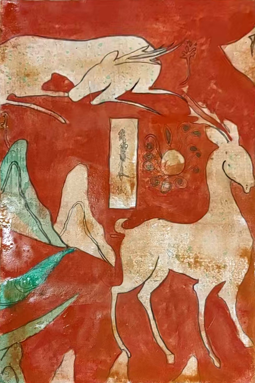 我的专业是水彩。水彩使用水溶性颜料,以水作为媒介,颜料的透明度较高;与中国画有所不同,中国传统壁画则是使用天然矿物色以及水干色颜料,相比水彩更加厚重。水彩的主要技法有:干画法、湿画法、干湿画法相结合,通过笔中水的多少来把握颜色的深浅;中国传统壁画则是先打底稿、再勾线、后画墨稿、最后上色。而敦煌莫高窟在经历了自然灾害后所呈现出的历史的破旧感,与水彩恰好有相似之处。通过这门课程的学习,我发现可以把中国传统壁画的表现方式运用到水彩之中,创新绘画方式,实现多种绘画方式的融合,给我日后的创作带来了全新的视角以及思路。