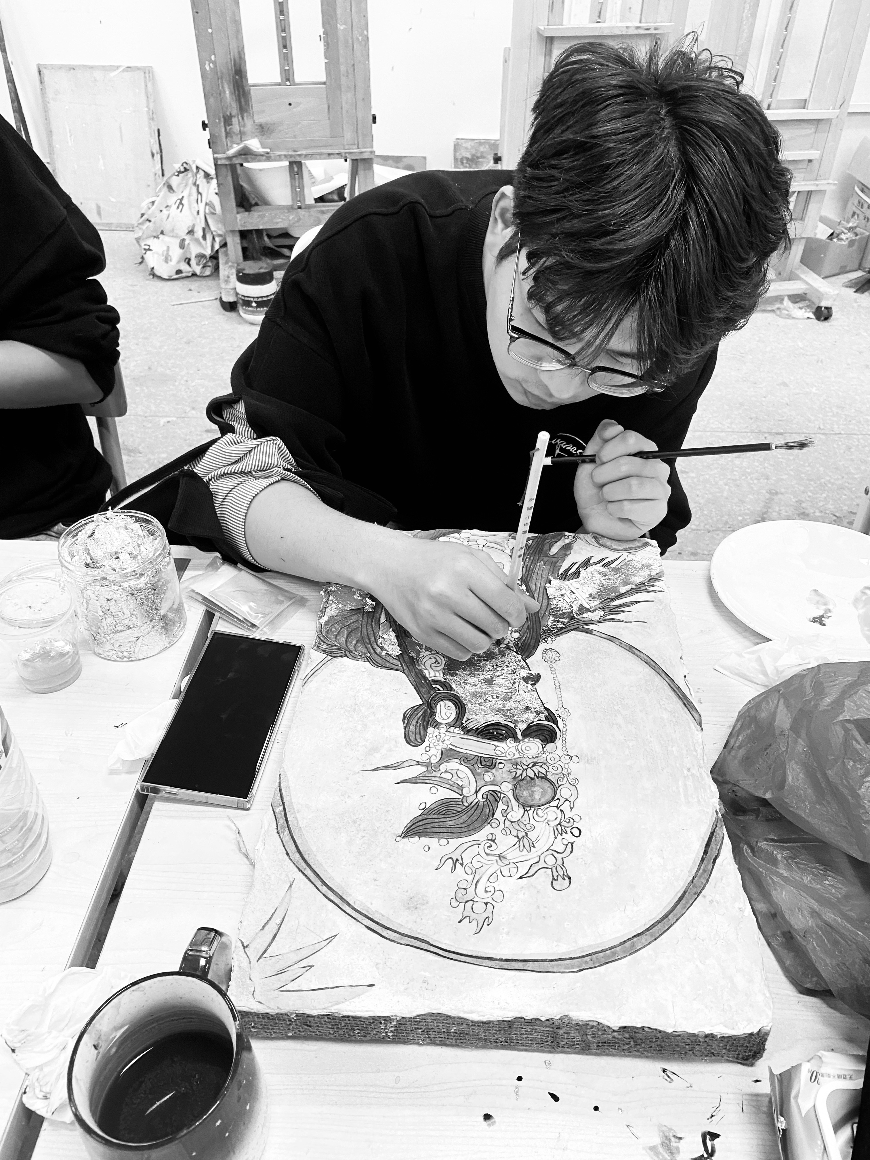 胡老师带着我们做地仗、模拟最真实的壁画体验,我们的作品也与原画同大,这都让我们更能深刻体会中国传统壁画绘画的语言表达。刚刚上手画的时候,我不太敢画,我们的画幅是最大的,但效果一直不强,导致我们小组出现明明应该是人多力量大却进度缓慢的问题。后来胡老师告诉我们254窟是北魏时期的,风格粗犷,可以大胆画…一直鼓励我们引导我们大胆的表现,最后我明白完成比完美更重要。在初次上色时,我采用水彩技法里的平涂法铺色与壁画原作有着较大差距,胡老师后来告诉我们中国画要以线造型,用线找型,通过练习,我也逐渐感受到了中国画画法的独特魅力。