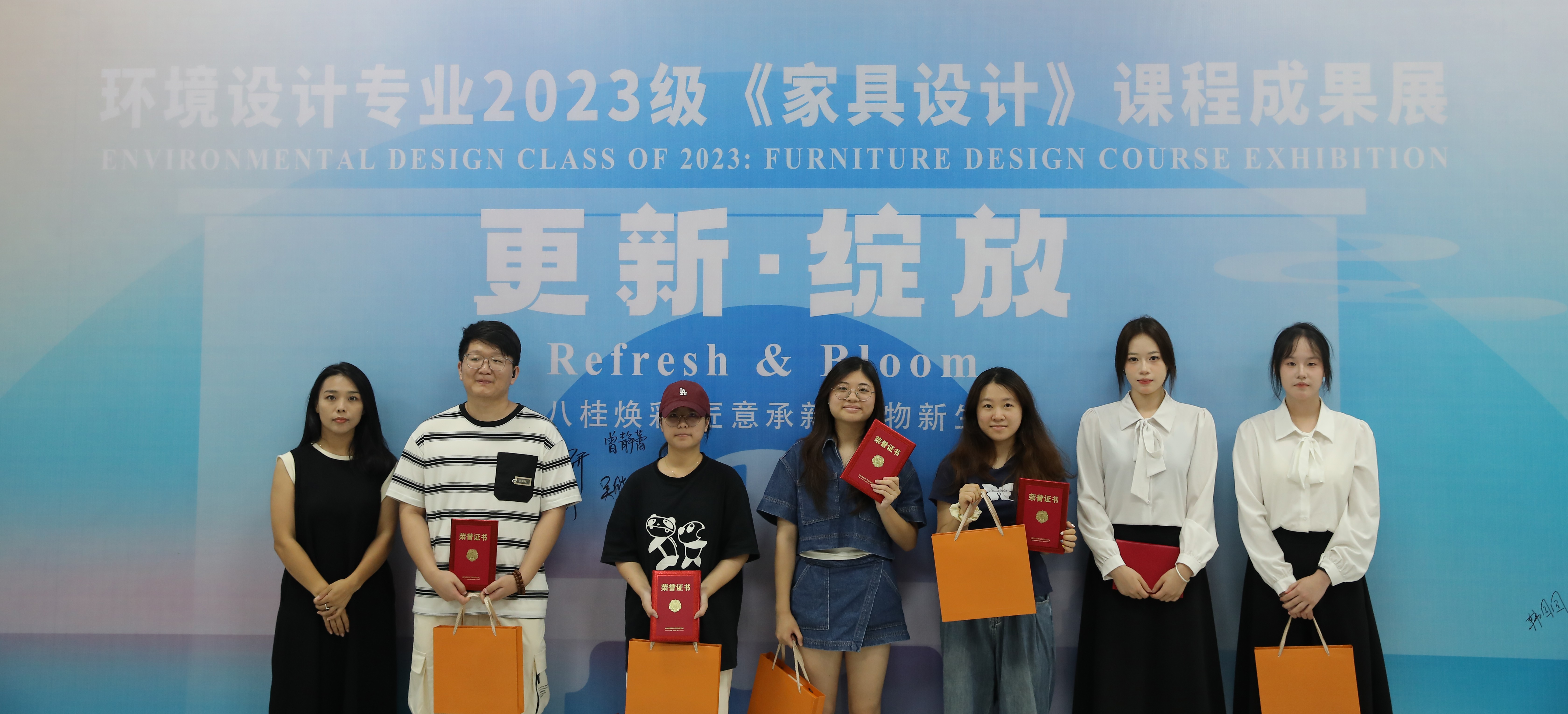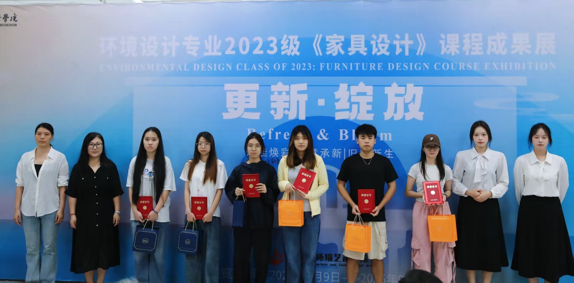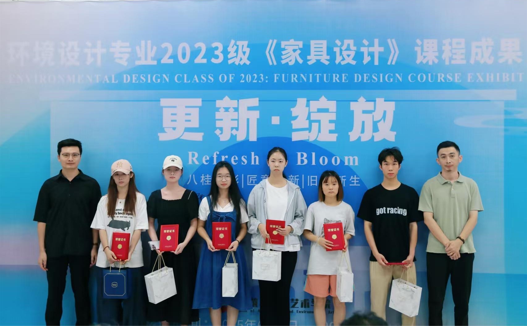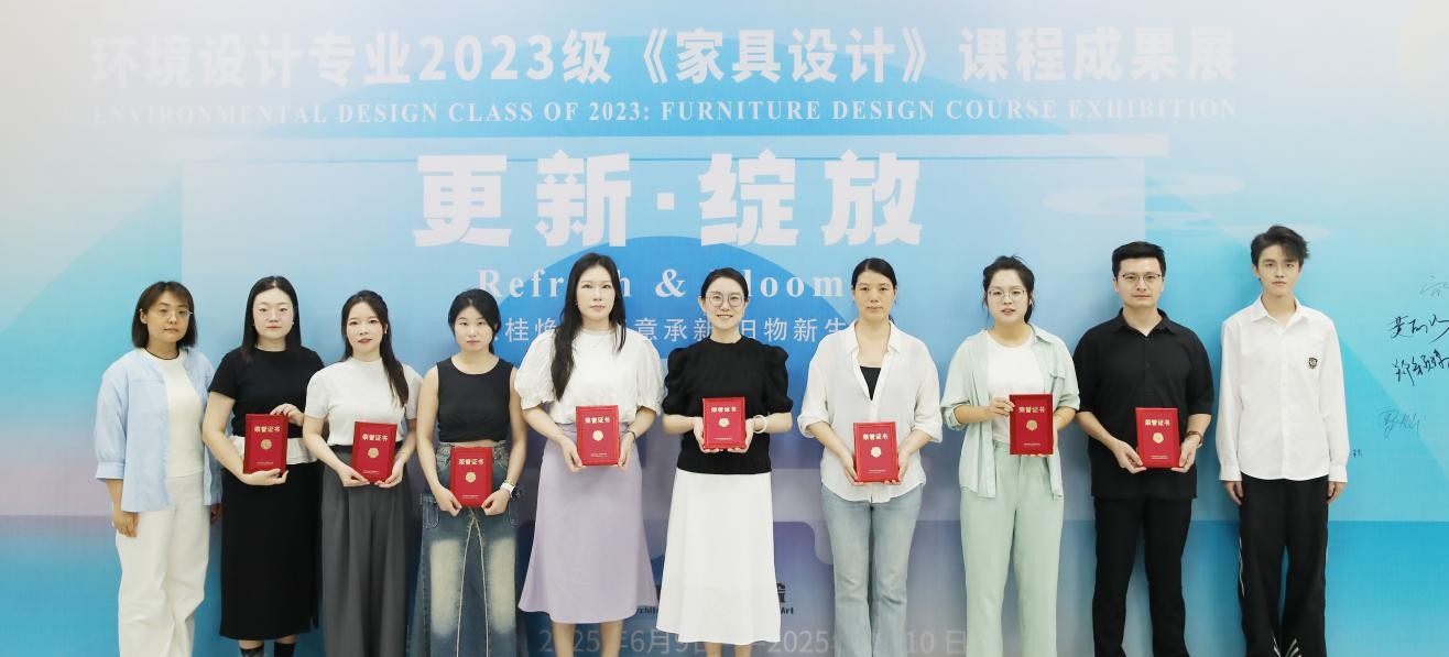 此次展览通过主题的表达、广西地域文化与传统非遗技艺的结合、家具的多功能等方面进行综合考量,评测出优秀奖35项,三等奖20项,二等奖10项和一等奖5项。课程组为等级奖项获奖同学制作了精美的奖品和证书。在充满激情和热烈的氛围中,出席领导、嘉宾现场为获奖学生颁发了荣誉证书。