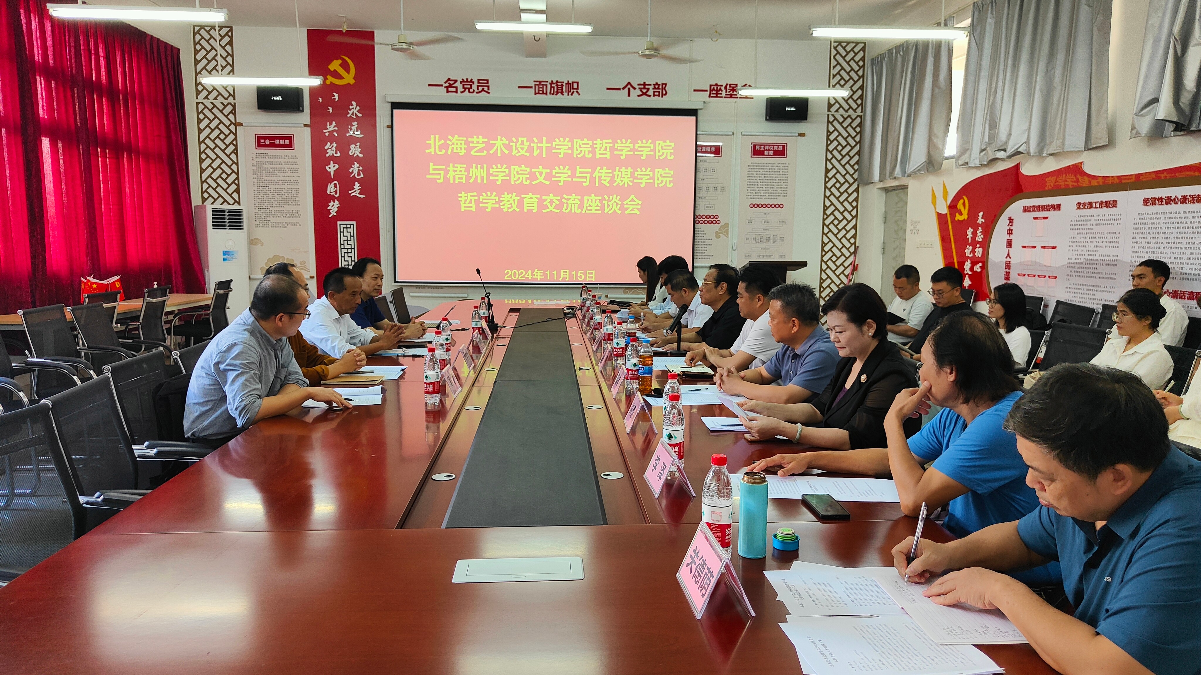 11月15日下午,梧州学院马克思主义学院书记、文学与传媒学院哲学学科带头人张朝松教授等一行五人应邀出席我校哲学学院哲学教育交流会,就两校哲学专业建设与学科发展开展交流座谈。广西大学现象学与马克思主义研究所负责人雷德鹏教授以特邀嘉宾出席座谈会。我校哲学学院院长兼哲学专业学科带头人蒙绍荣教授、常务副院长李水亮、副院长蒋辉平、副院长覃传茵及哲学教研室全体专任教师参会,会议由覃传茵副院长主持。