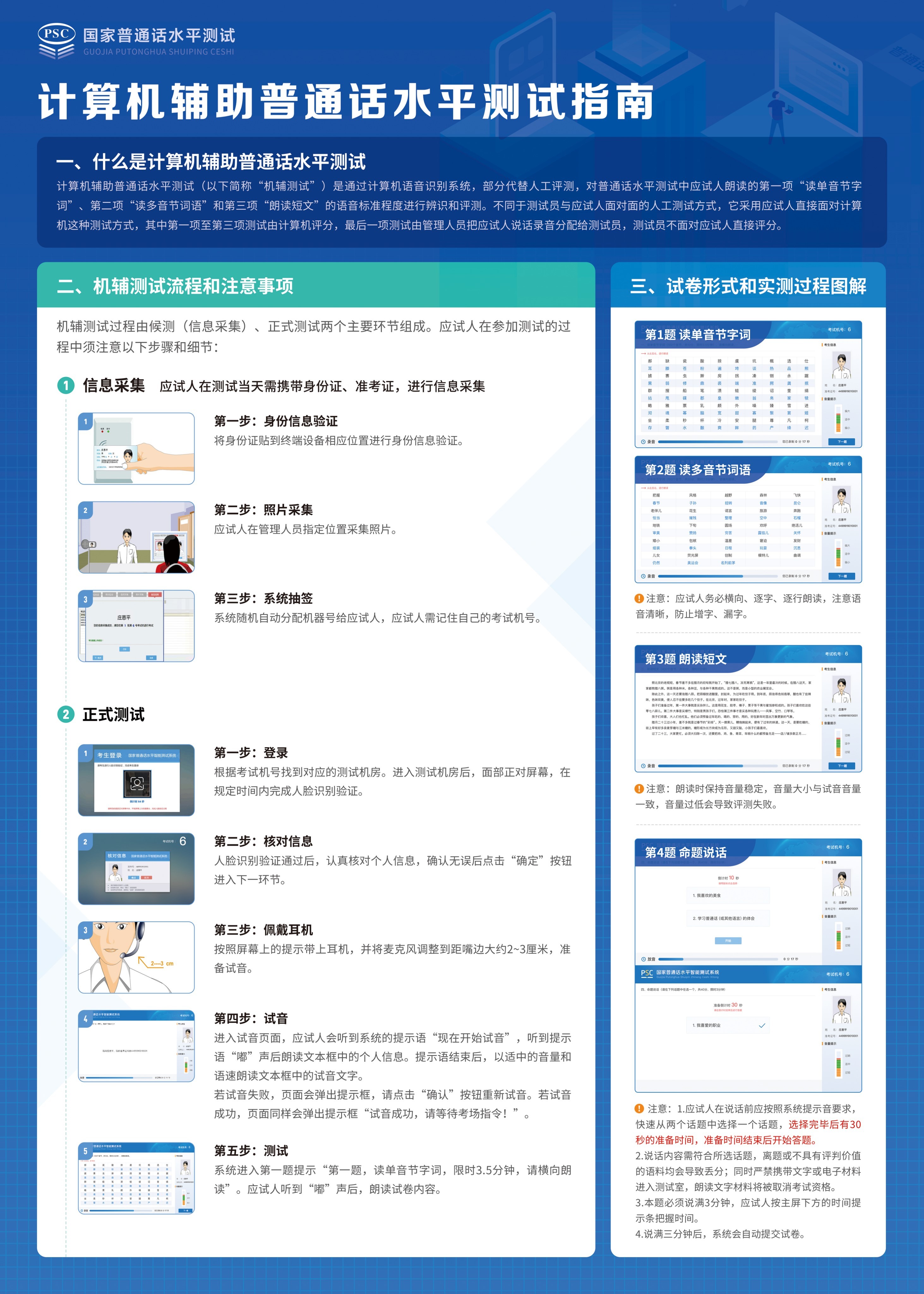 (四)根据《普通话水平测试管理规定》(教育部令第51号)和《普通话水平测试规程》(国语函〔2023〕1号)等相关文件规定,自2023年4月1日起,普通话水平测试将使用人脸识别防作弊系统进行现场信息采集和抽签,取消备测室和备测时间等备测环节,测试试卷由系统随机分配。具体考试流程和注意事项详见附件2和附件3。