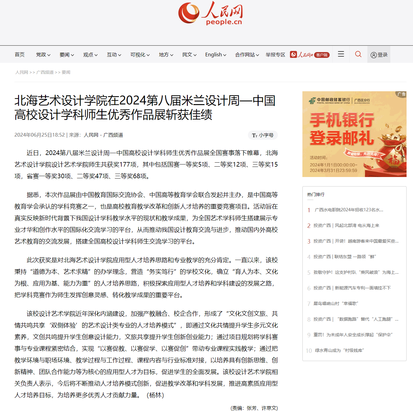 人民网:北海艺术设计学院在2024第八届米兰设计周—中国高校设计学科师生优秀作品展斩获佳绩