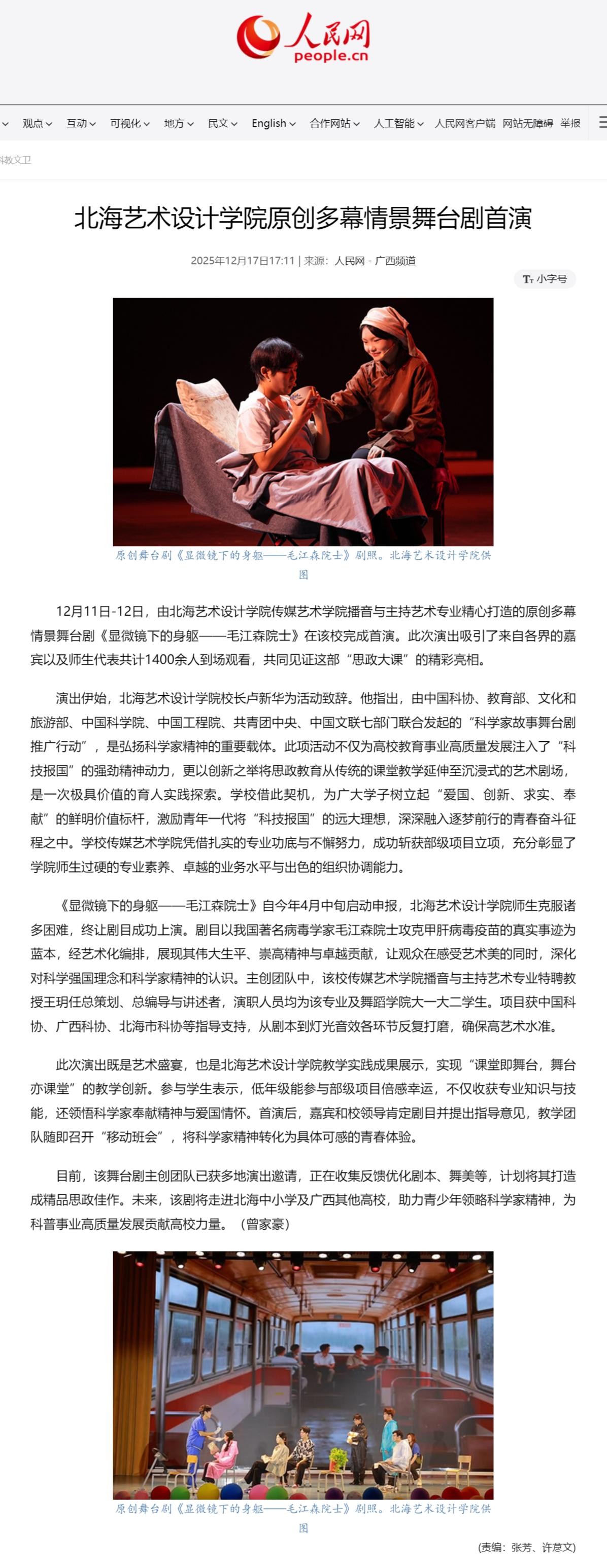 人民网:北海艺术设计学院原创多幕情景舞台剧首演