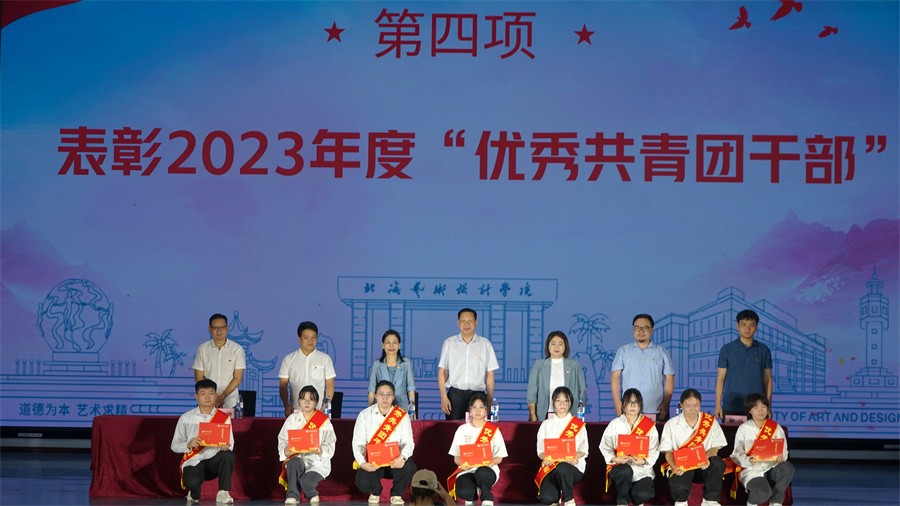 在表彰大会上,党委副书记陈毅华宣读了北海艺术设计学院2023年度“树立榜样形象 弘扬五四精神”五四表彰的决定。表彰建筑与环境艺术学院环境设计专业2106团支部等29个团支部获得“五四红旗团支部”,178名学生获得“优秀团干部”称号,218名学生获得“优秀共青团员”称号。