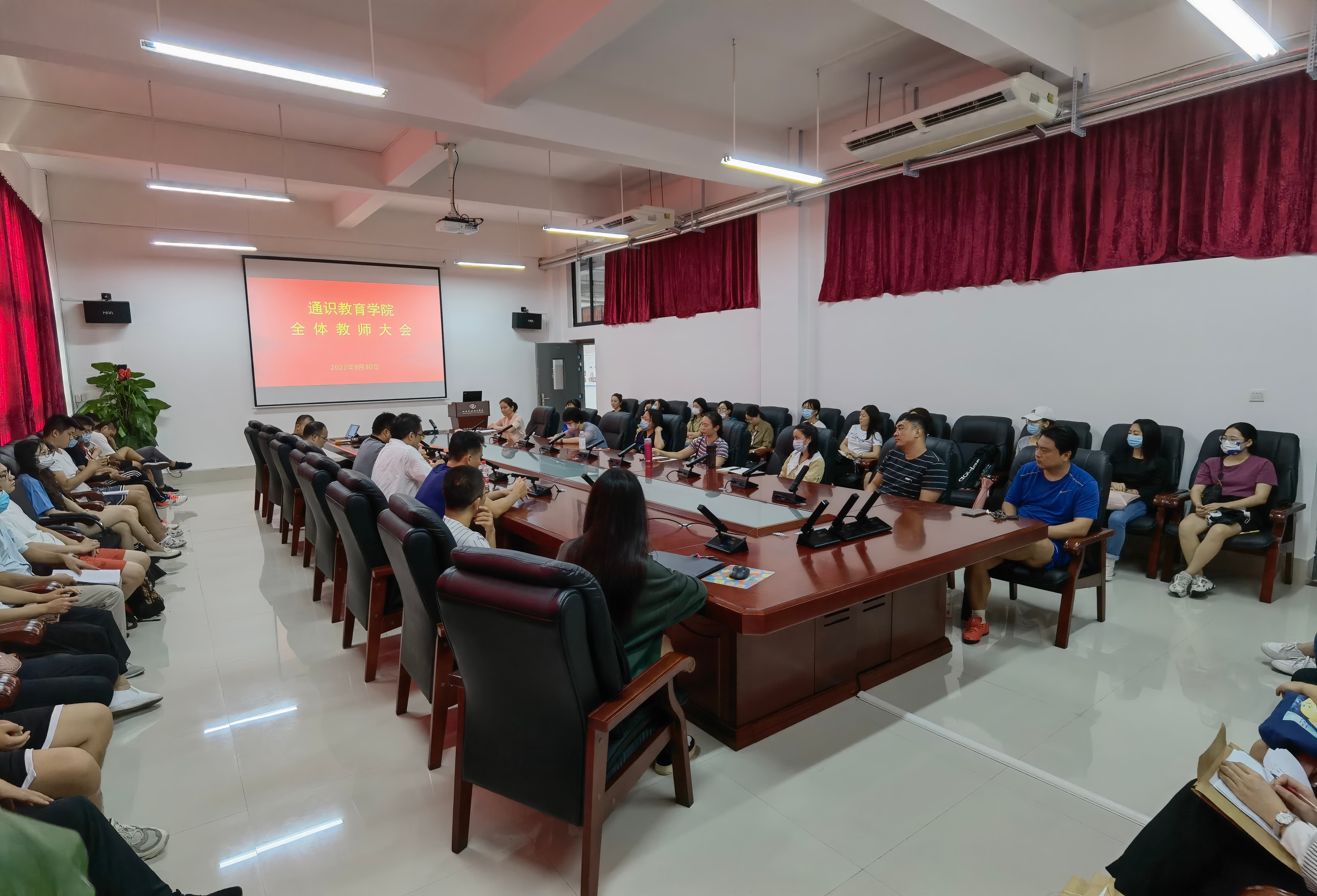 2022年9月30日15:00,通识教育学院在图书馆四楼会议室召开全体教师大会,副校长陶立阳、通识教育学院院长杨莹、副院长黄丹出席会议,会议由综合办公室主任王志华主持。