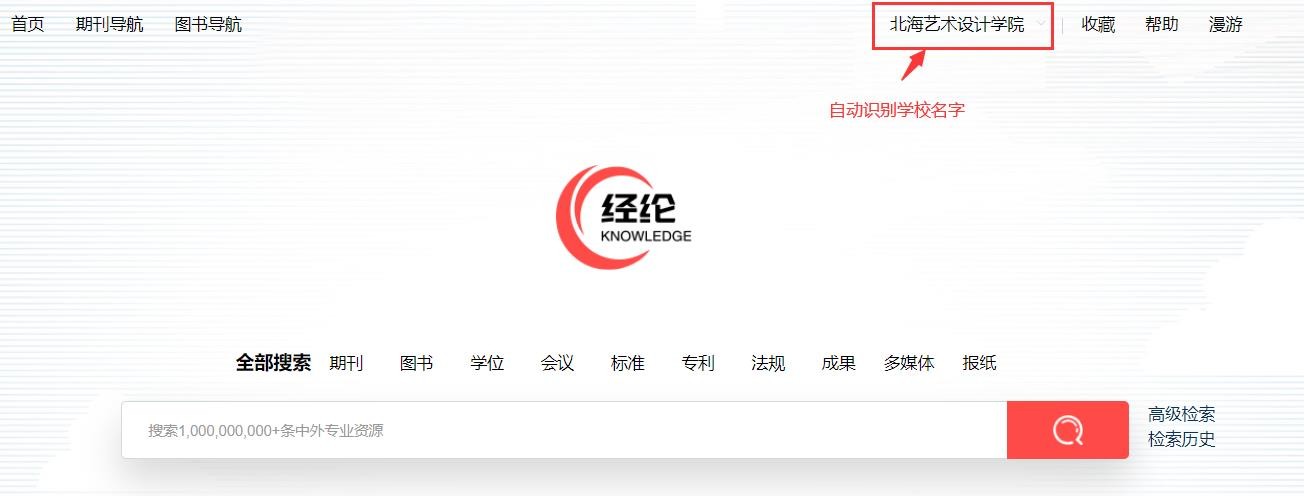 1.在校园网内打开经纶平台网址:http://k.vipslib.com/,系统会自动登录,右上角会有学校名称认证,如打开网址后提示要登录,请前往校园网环境使用。