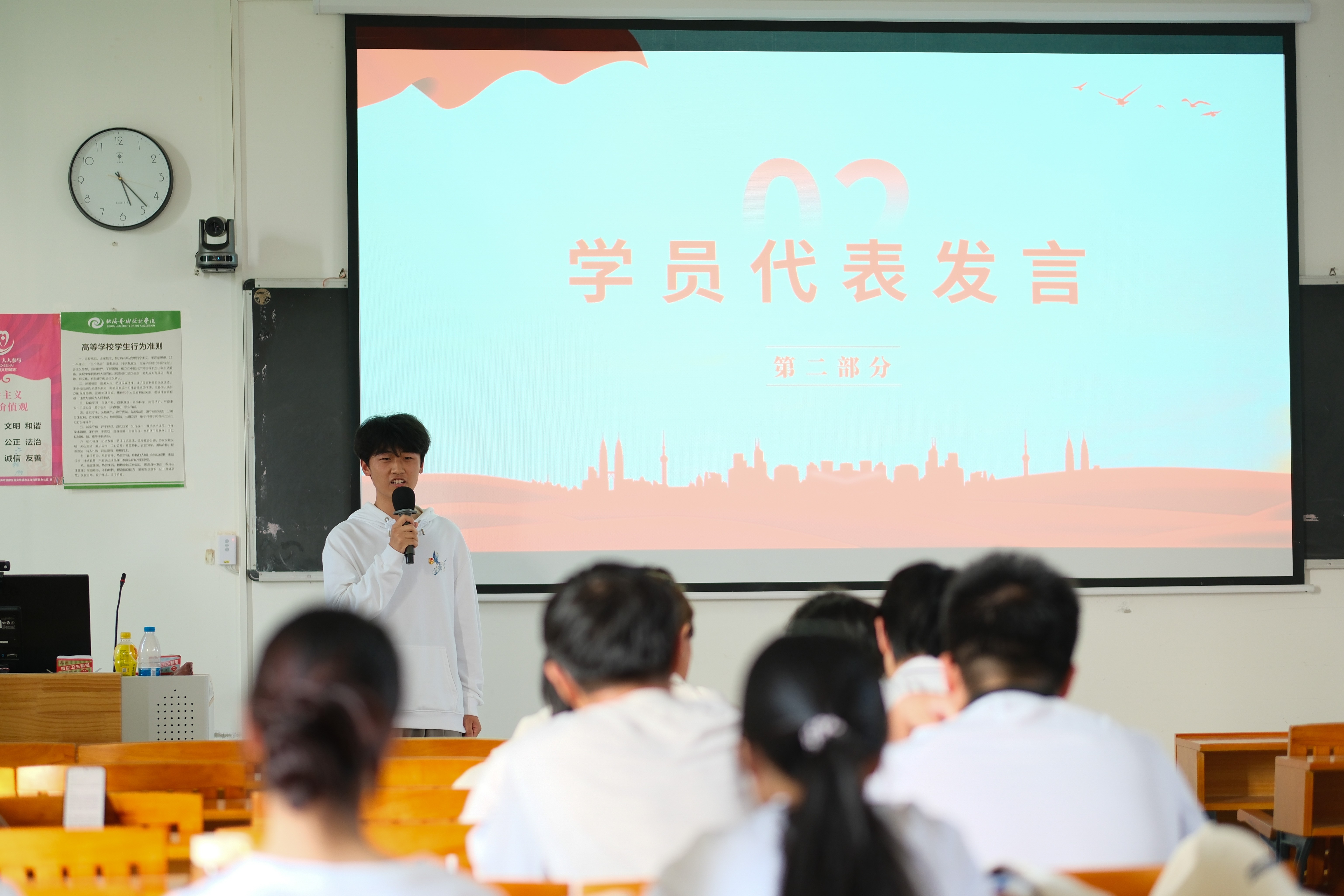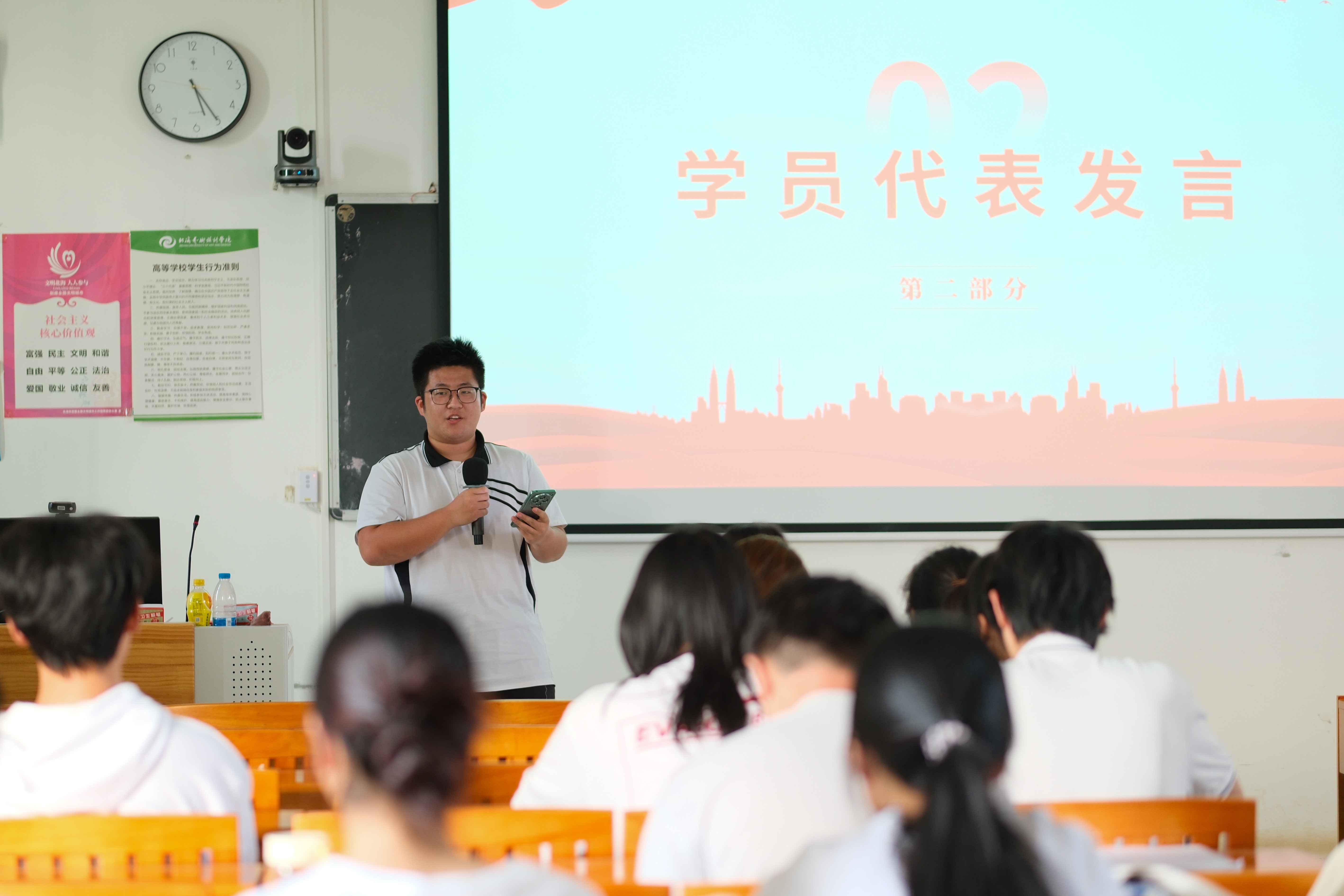 随后,由学员代表进行发言。哲学学院学员代表刘昊天同学表示,“青马工程” 的学习经历是一次思想的淬炼与成长的蜕变,未来将以此次学习为新起点,积极发挥青年骨干的模范带头作用,以实际行动带动身边同学共同进步;将个人理想融入国家发展大局,让青春在强国征程中绽放绚丽光彩。