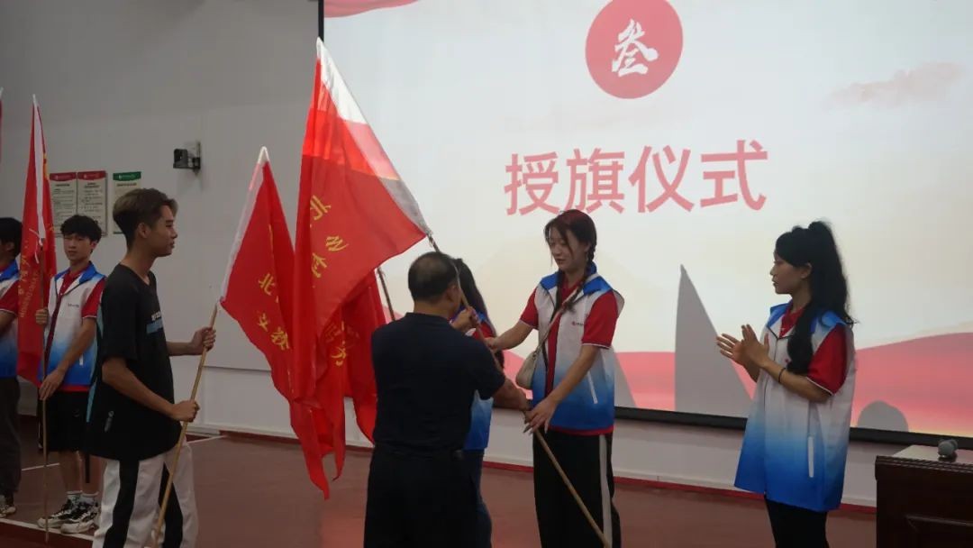 (校党委书记范徽忠为三下乡志愿者团队进行授旗仪式)