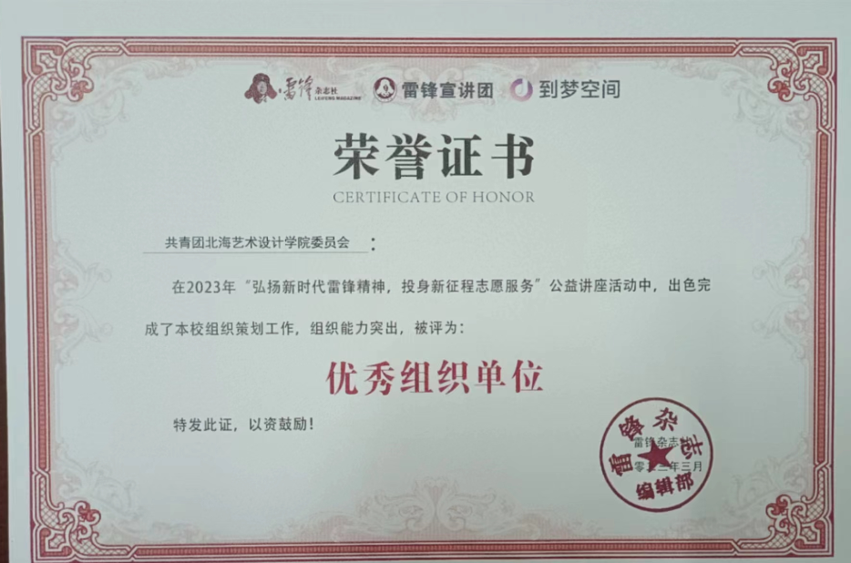 共青团北海艺术设计学院委员会在雷锋杂志社、到梦空间主办的2023年“弘扬新时代雷锋精神,投身新征程志愿服务”公益讲座活动中,出色完成了组织策划工作,组织能力突出,荣获优秀组织单位。