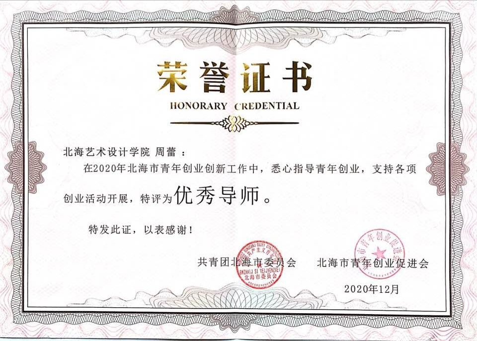 周蕾老师不仅有丰富的教学实践和研究经历,还擅于辅导和帮助学生参加各级各类赛事。仅近几年组织、指导学生参加的赛事就有15项,如:2020年8月,指导学生姚远参加第六届中国国际“互联网+”大学生创新创业大赛项目,荣获国家级铜奖;2020年10月,指导学生张志桓参加“第三届广西中华职业教育创新创业大赛暨第四届中华职业教育创新创业大赛,荣获广西区金奖;2019年,指导学生唐庆参加“全区高校第三届大学生创客马拉松”荣获自治区一等奖;2021年,辅导学生马丰杰创作的作品《石雕归墟》荣获广西壮族自治区委员会统一战线工作部主办第三届中华职业教育社非遗创新大赛广西赛区本科组第三名,并获国赛推荐资格。其次,辅导各级各类自治区级赛事银奖2项、铜奖13项。由于周蕾老师的辛苦付出、培育,让她收获了多项个人奖项和荣誉,如2021年,参加广西壮族自治区委员会统一战线工作部主办第三届中华职业教育社非遗创新大赛获广西区赛非遗教学成果团队二等奖;荣获自治区“优秀创新创业导师”和“优秀指导老师”、北海艺术设计学院“师德先进个人”、北海市青年创业创新“优秀导师”等荣誉称号。