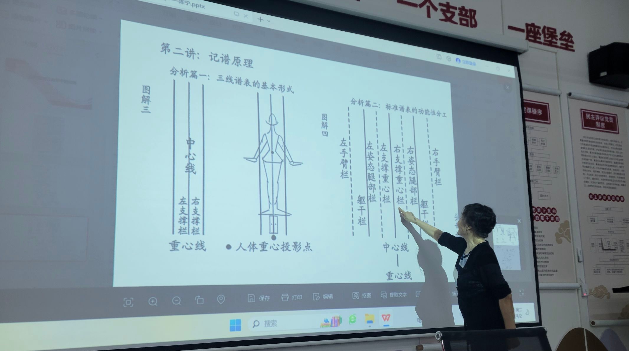 陈宁老师在交流会上作题为“拉班舞谱在教学中的应用”的讲座。陈老师指出,拉班舞谱是世界公认的一种既科学又形象并富有逻辑分析的记录体系,是迄今为止流传最广、也最为实用的舞谱。使用拉班舞谱进行舞蹈教学,教师可以更清晰地传达舞蹈动作的要领,学生可以更准确地掌握舞蹈技巧,从而加速学习进程。讲座过程中,陈老师亲自示范拉班舞谱教学实践,其示范准确、到位,感染力强。陈老师以生动的语言和流畅的动作,将拉班舞谱的精髓展现得淋漓尽致。与会教师们被陈老师的示范深深吸引,不由自主地参与其中,一同体验拉班舞谱的魅力。