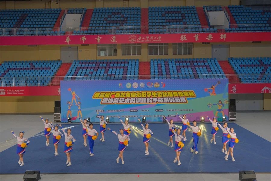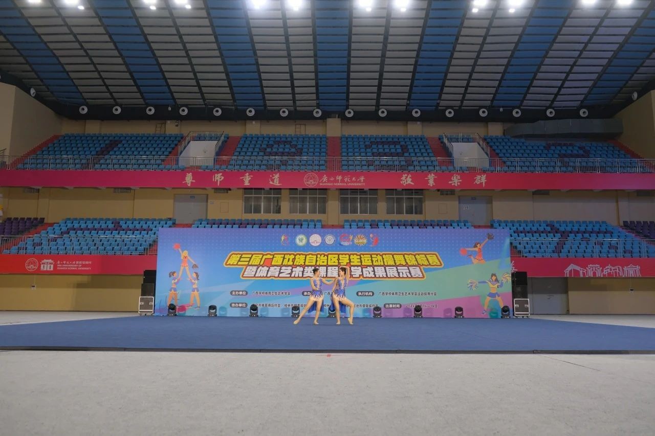 6月14-16日,第三届广西壮族自治区学生运动操舞锦标赛暨体育艺术类课程教学成果展示赛在广西师范大学雁山校区综合体育馆落下帷幕,我校“战马”啦啦操队斩获普通本科组“第九套广播体操、集体爵士自选、双人爵士自选、双人花球自选”4项冠军,民族民间舞季军,同时斩获“体育艺术类课程教学成果展示赛”二等奖。