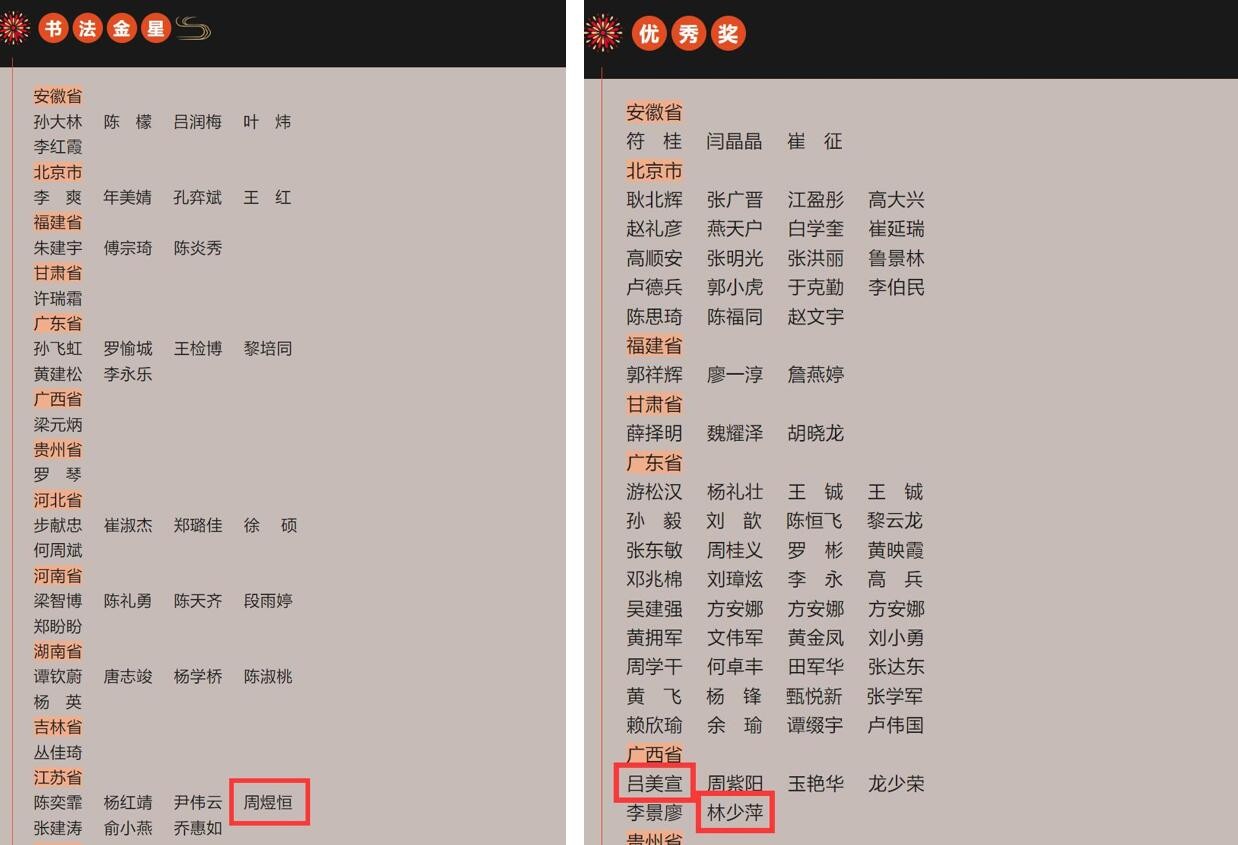 在第三届“简之杯”全国书法展中,书法学院共计三名学生在成人软笔组斩获佳绩。其中周煜恒同学获“书法金星”(一等奖),吕美宣、林少萍同学获优秀奖。