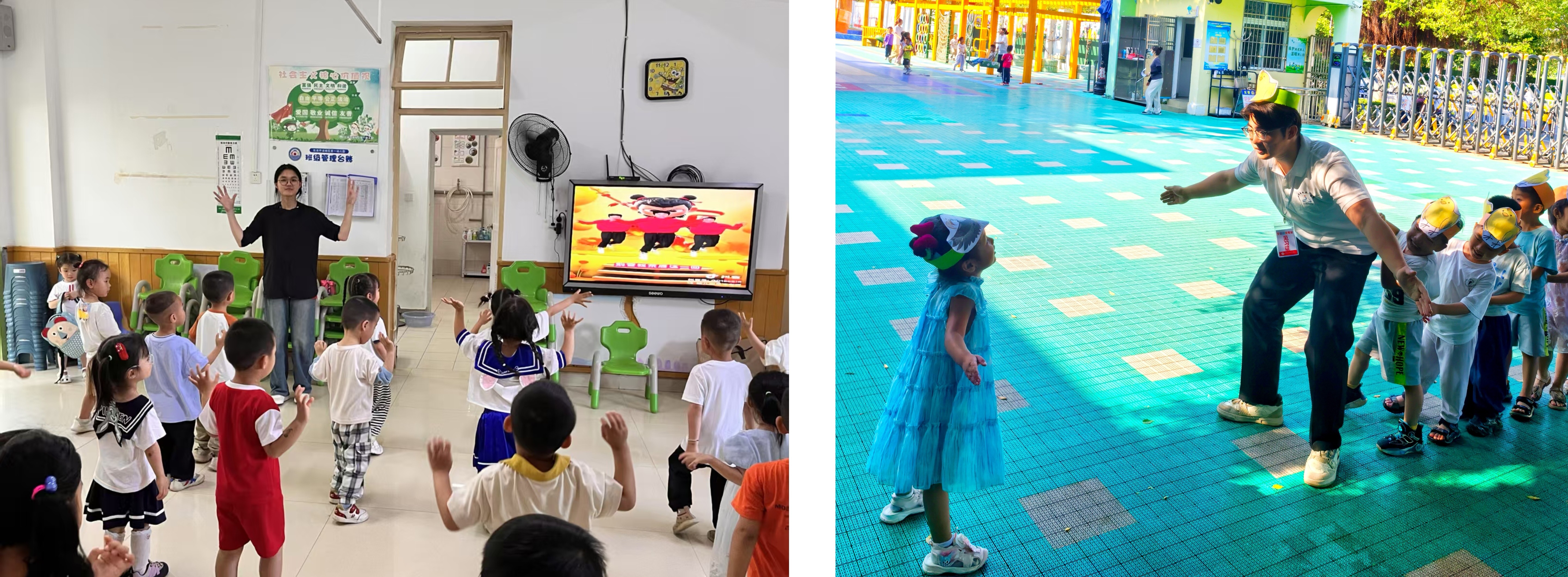学前2402班李智燕带领幼儿做律动 学前2401班丁朝旭与幼儿游戏