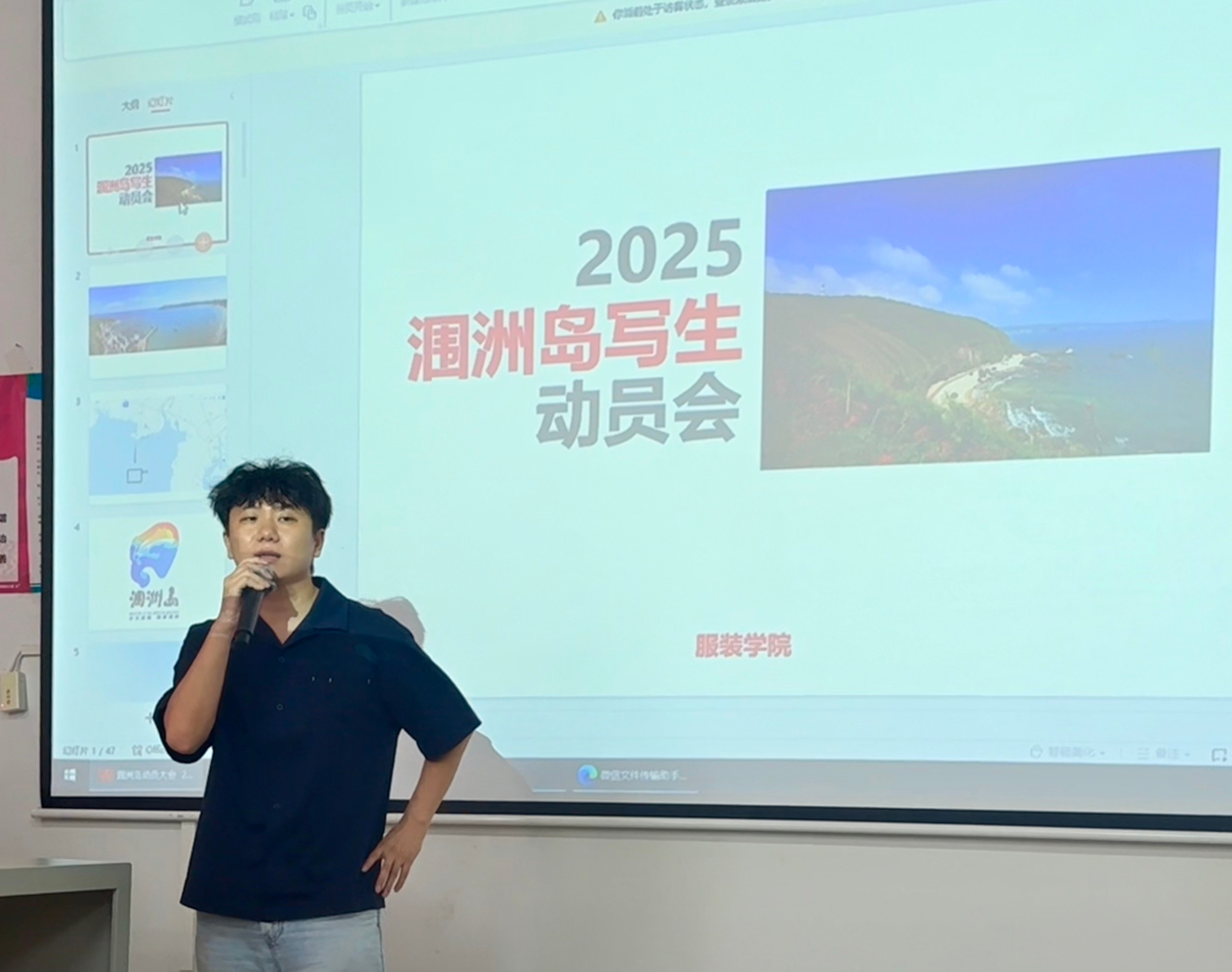 大会上,《写生》课程主讲教师江百汇详细讲解了读涠洲岛写生的各项教学任务指标、风景写生的技法要点与实施路径。结合专业人才培养需求,江百汇老师还为同学们开展摄影基础知识点培训,鼓励全体学生在写生实践期间同步创作摄影作品,积极参与我校第六届涠洲岛“鲸鱼杯”手机摄影大赛,以多元创作提升专业综合素养。