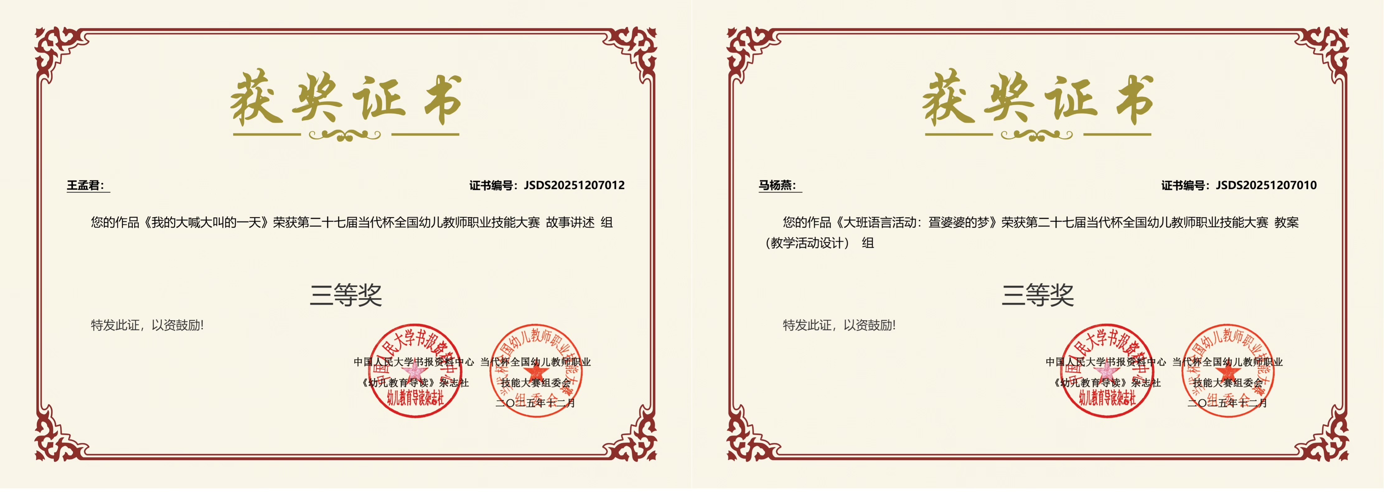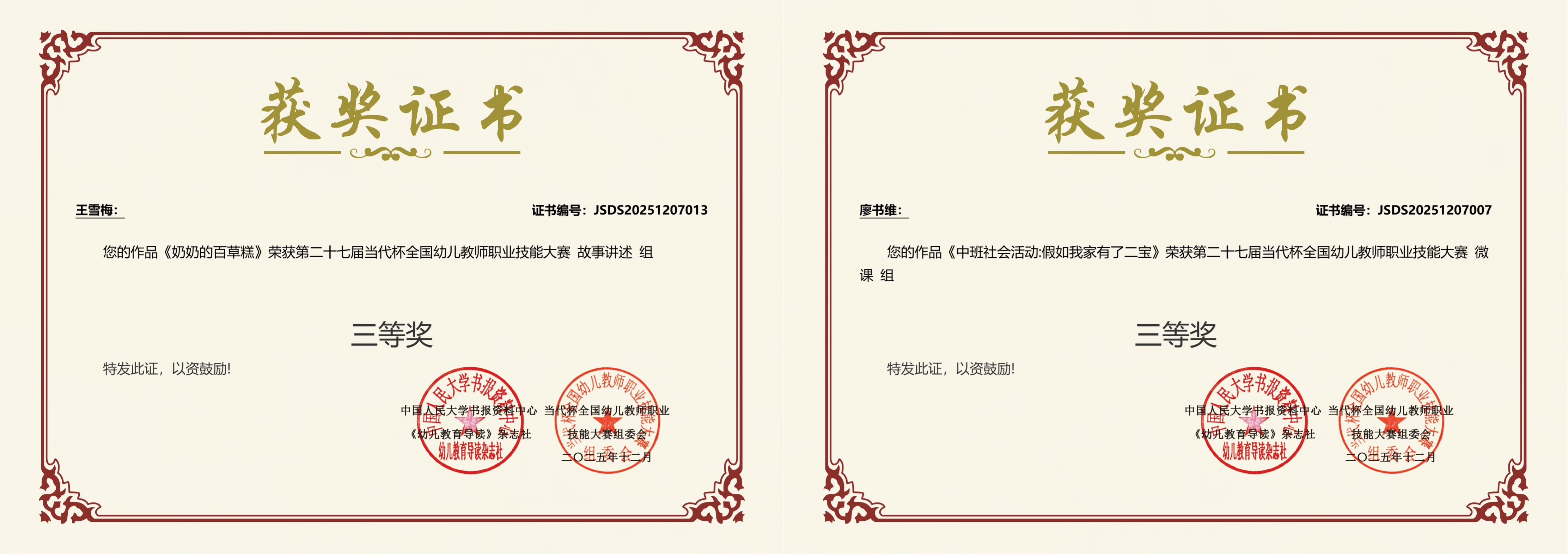 12月25日,第二十七届 “当代杯”全国幼儿教师职业技能大赛结果揭晓。我校教育学院积极组织学前教育专业学生参赛,共报送8份作品,斩获一等奖1项、二等奖1项、三等奖4项、优秀奖2项。