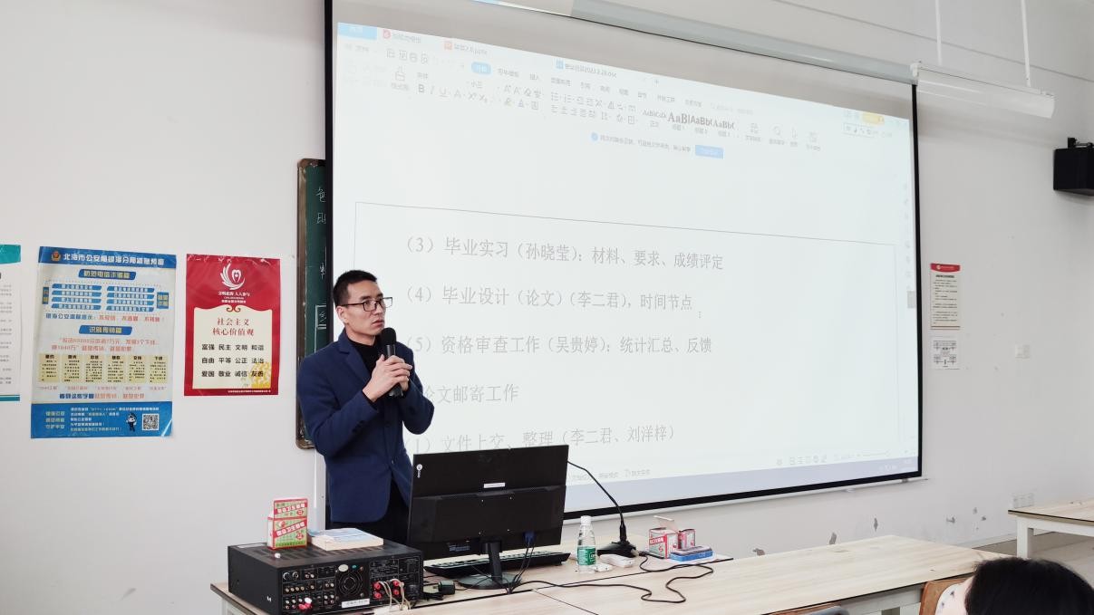 专业考察由徐建国老师负责;社会实践由雷勇老师负责;毕业实习由孙晓莹老师负责;毕业论文由李二君老师负责;资格审查由吴贵婷老师负责。