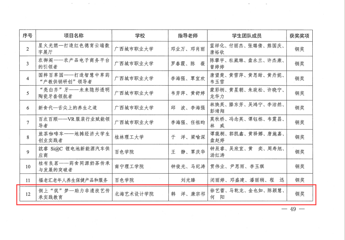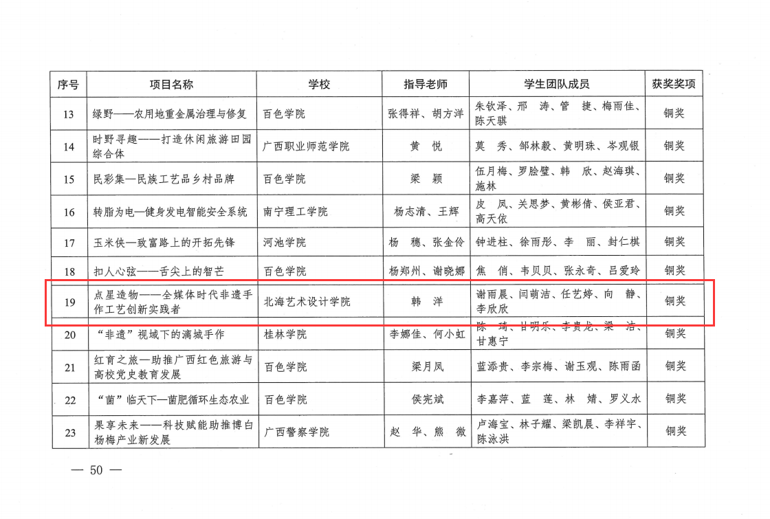 其中北海艺术设计学院美术学院教师韩洋指导的项目“点星造物——全媒体时代非遗手作工艺创新实践者”荣获本科组铜奖,由韩洋、康宗祁老师指导的项目“侗上‘筑’梦——助力非遗技艺传承实践教育”荣获本科组铜奖。