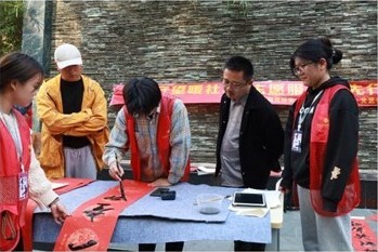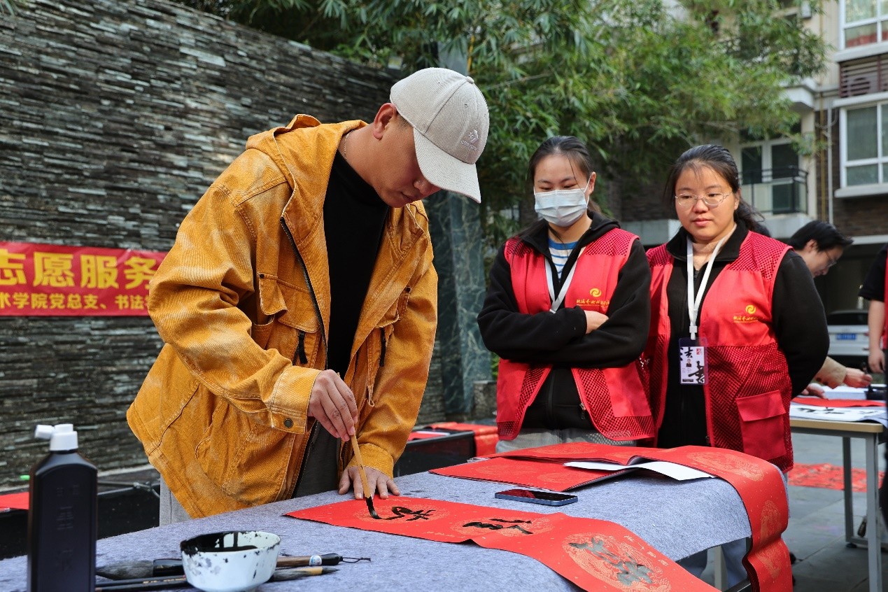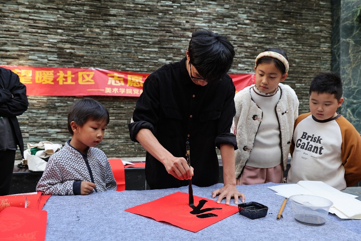 书法学院党支部书记喻广林、党支部副书记左云飞、美术学院学生第一支部副书记许荣军、书法学院学工办主任兼分团委书记李家琪、书法学院教研室副主任张天赋,书法学院教师石建玲,书法学院教师江威龙以及美术学院和书法学院的部分学生参与活动。他们充分发挥自身的专业优势,共同为社区居民送来新春祝福,让社区充满浓浓的节日气息。此外,活动也受到校、院领导的支持与关注,校党委副书记彭仁、美术学院执行院长龚为莅临现场指导。在这个团圆与祈福的冬至时节,两院师生们以笔为媒,以墨传情,为社区居民送上最真挚的祝福。