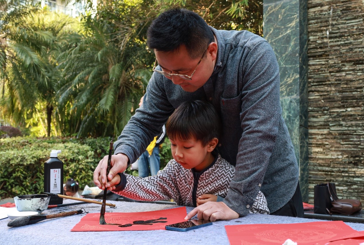 两院师生们以其精湛的书写技艺,不仅展现了书法艺术的魅力,更吸引了众多社区居民驻足欣赏,投入到书法艺术之中。现场呈现出其乐融融的景象。很多居民热情高涨地参与书写春联与“福”字。老师们更是倾囊相授,他们手把手地指导小朋友书写对联。在老师的耐心引导下,小朋友们逐渐掌握了书写技巧,稚嫩的笔触下,一个个充满童趣的汉字跃然纸上,虽然笔法稍显青涩,但字里行间却满是喜悦。不少居民感慨道,手写春联不仅彰显了对传统文化的深深敬意与传承,更为即将到来的节日增添了一抹浓厚的喜庆氛围。认为这样的活动不仅传递了节日的祝福,更拉近了邻里之间的距离,让传统文化在社区中焕发出了新的生机与活力。