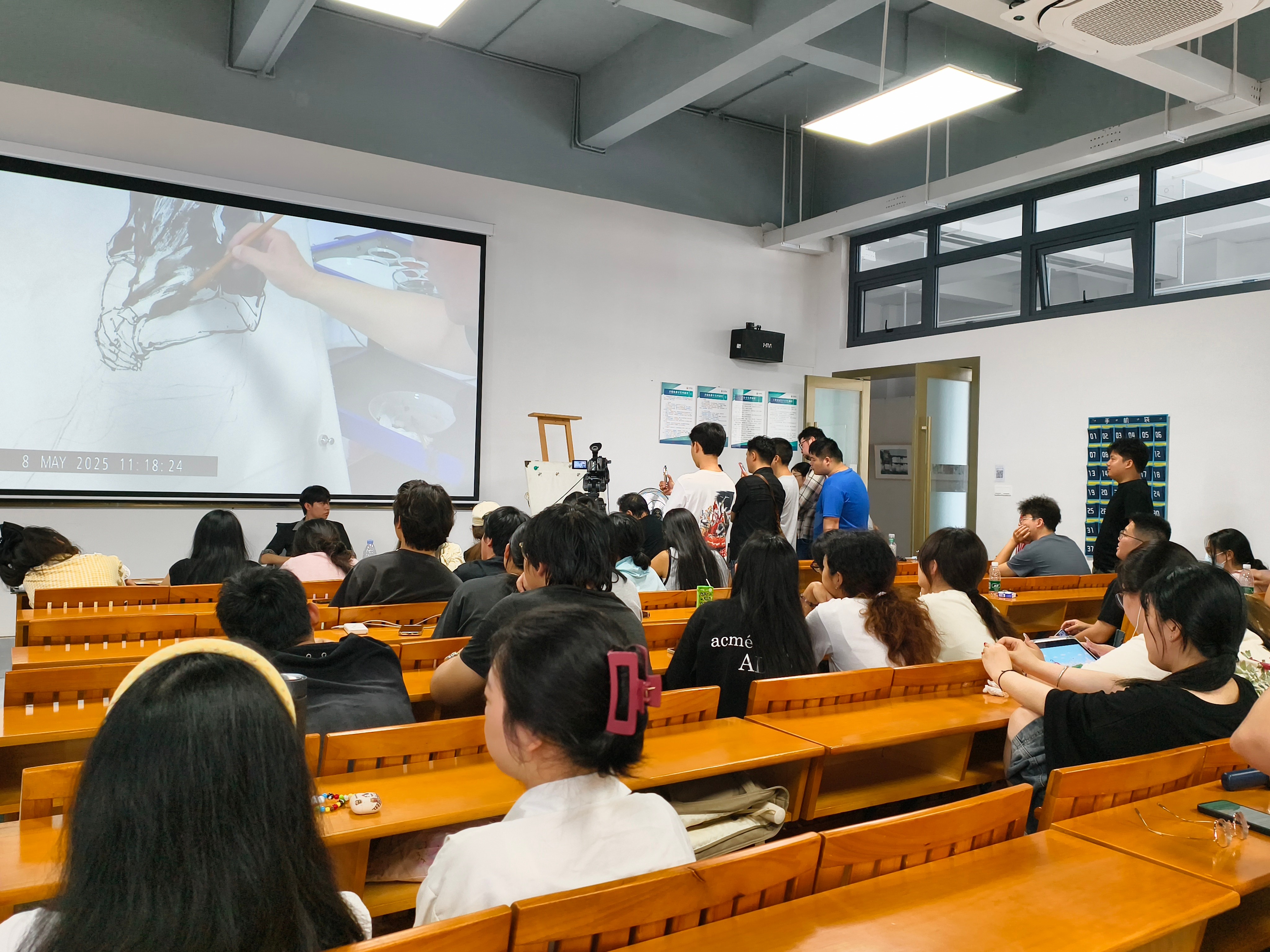本次讲座最大亮点在于李洋教授的现场写生示范环节。在师生们的屏息注视下,他以教室环境为对象,从构图构思、线条取舍到色彩铺陈,将理论知识转化为具象实践。笔触游走间,画面逐渐鲜活,李洋教授同步讲解观察方法与创作思路,让观众直观感受到从观察到表现的艺术转化过程。