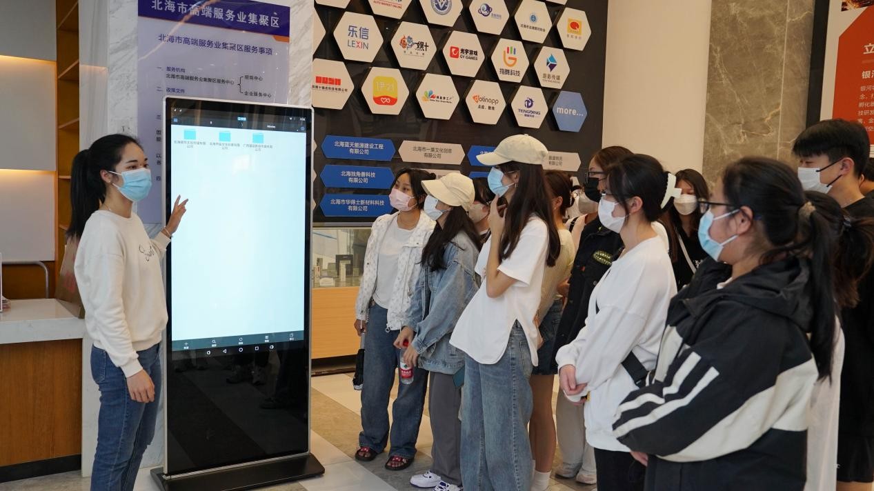 园区负责人梁张月带领师生进行参观,通过讲解介绍园区的企业文化、办公环境、就业政策、园区配套等情况,并实地参观北海365、卓美文化、纽博生物等部分企业。