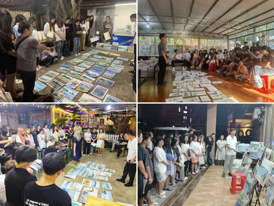 接下来的三天,在教师的带领下同学们前往涠洲岛革命烈士纪念碑、南湾码头、涠洲岛火山国家地质公园和盛塘村开展教学实践活动,大家运用所学美术与设计专业方面的知识,以画笔记录下涠洲岛的自然景观与人文风貌,在实地考察中感受岛上的民俗、历史与发展。在白天的写生过程中,教师们通过现场讲授、作范画、逐个辅导等方式从取景、构图、光线、色调等方面为同学们进行了悉心的指导。晚上,教师们组织各班级开展集中讲评活动,指出画面中的优点和不足,分析问题,总结得失。