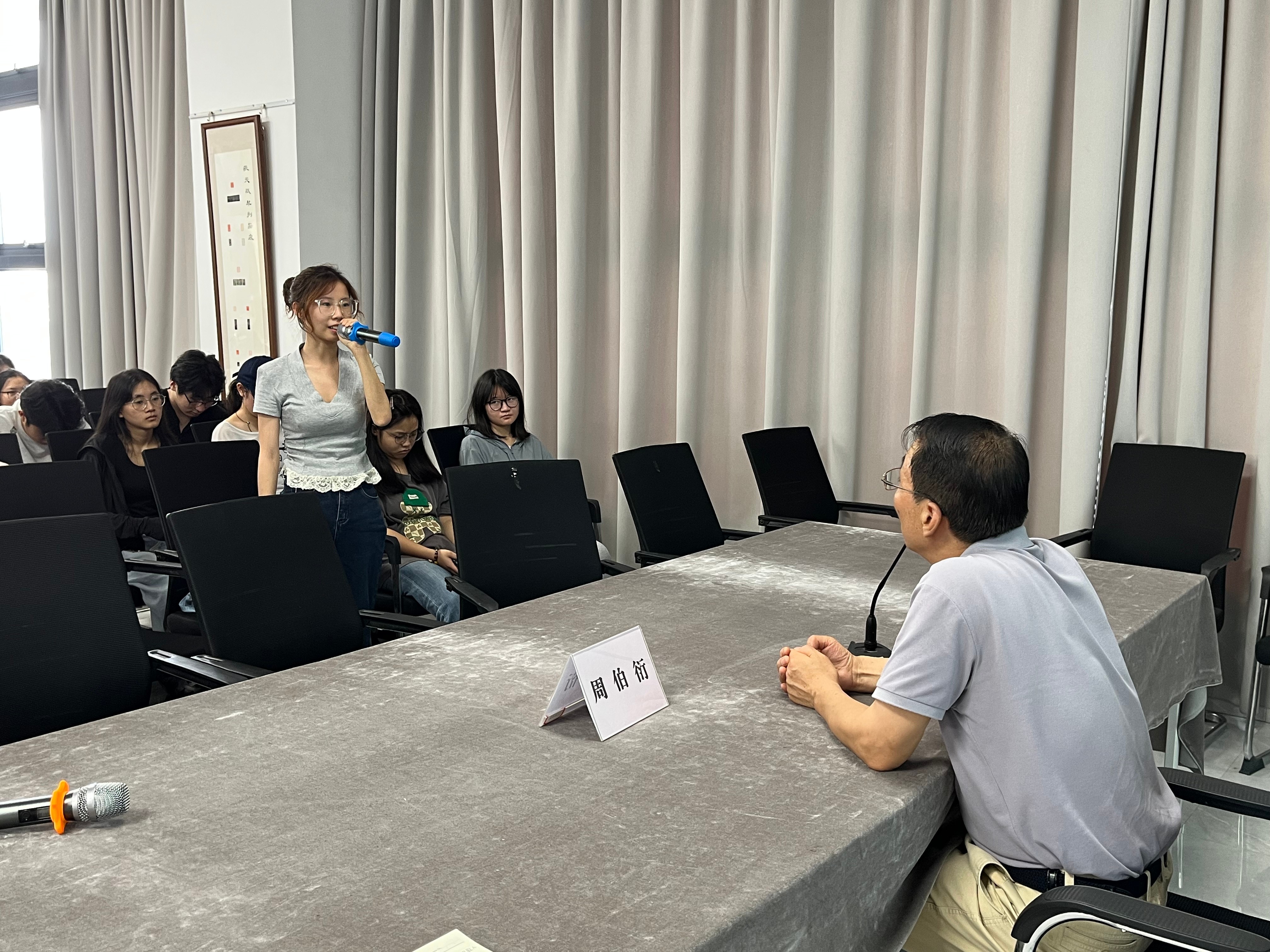 座谈会上,周伯衍教授结合个人学书历程,分享了宝贵的艺术经验与治学心得。他勉励同学们拓展知识视野,秉持“杂粮养人,杂学养文”的理念,在持续学习中提升综合素养。他强调,艺术探索永无止境,应在继承传统的基础上勇于创新、寻求突破。在交流环节,学生们踊跃提问,周教授逐一进行细致解答。随后,李和生主席作补充发言,进一步丰富座谈内容,拓宽了学术视野。