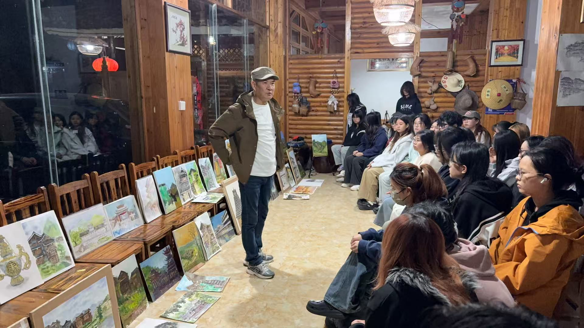 三江侗寨以其独特的鼓楼群、风雨桥和淳朴的侗族风情,成为美术写生的绝佳之地。邹光平教授不顾旅途劳顿,一到驻地便带领学生深入村寨,选取最佳写生角度。他现场示范,从取景构图、光影处理到色彩运用,深入浅出地讲解如何将侗寨的建筑特色与文化底蕴融入画面。