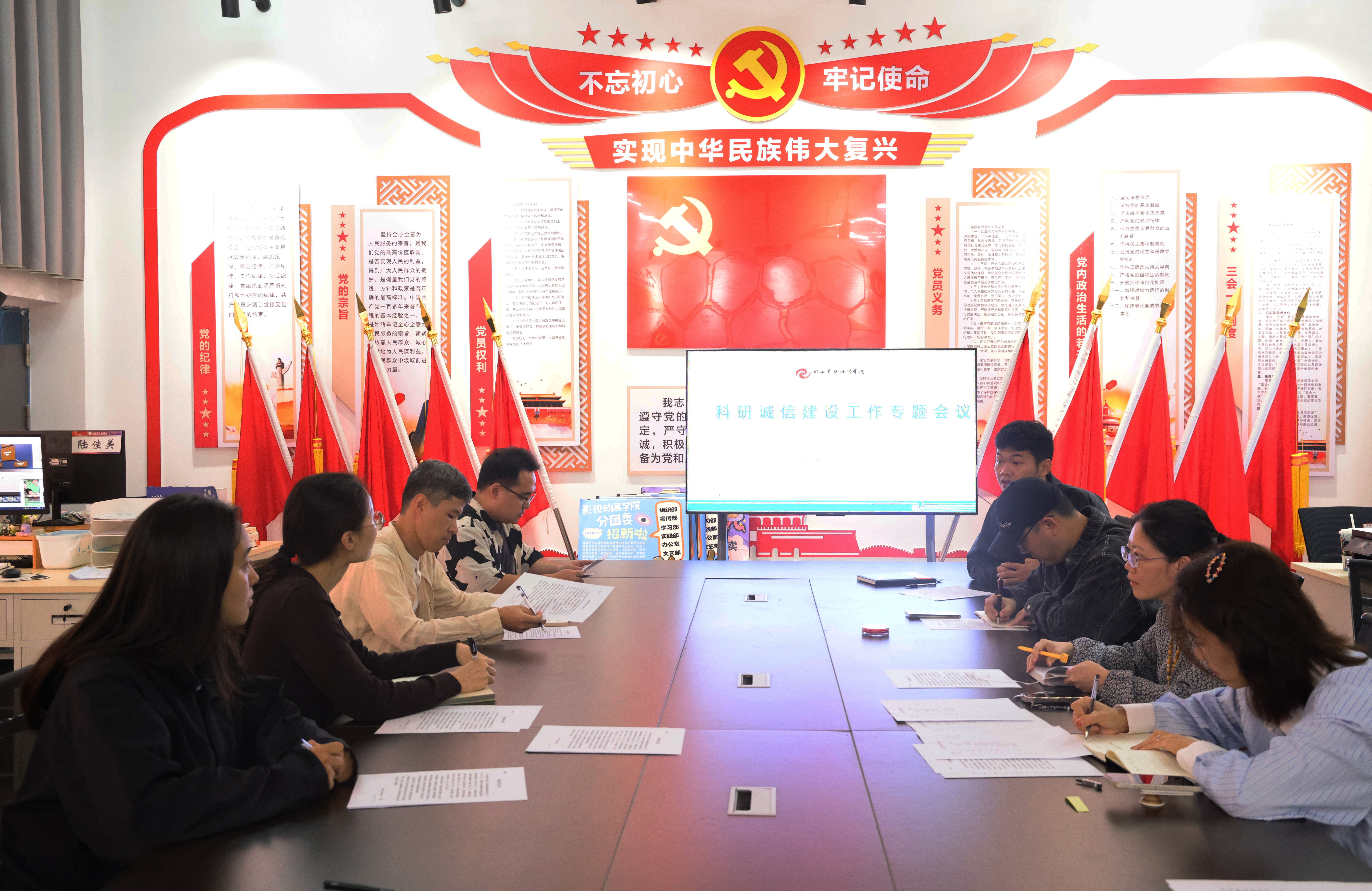 活动伊始,学院高度重视并组织了一场面向全体教师的科研诚信专题学习会。会议由AI艺术学院副院长姚猛主持,与会人员覆盖全院教师8人。会议深入解读了《高等学校学术不端行为调查处理实施细则》、《北海艺术设计学院科研诚信管理办法》等政策文件,系统明确科研失信行为范畴、惩戒措施,并结合AI艺术学科特点细化内容,明确AI生成素材未标注来源、数字作品抄袭篡改、跨平台参赛版权声明缺失等科研失信行为范畴,及撤销项目、追回经费、记入失信数据库等惩戒措施;针对青年教师关注的AI建模原创性界定、学术论文中艺术作品引用格式等问题,开展现场研讨。会后,全院教师签署《科研诚信承诺书》并按手印,重点突出“严”,明确在AI艺术创作、科研项目申报、学术成果发表中严守诚信底线,并将承诺内容纳入教师师德考核。