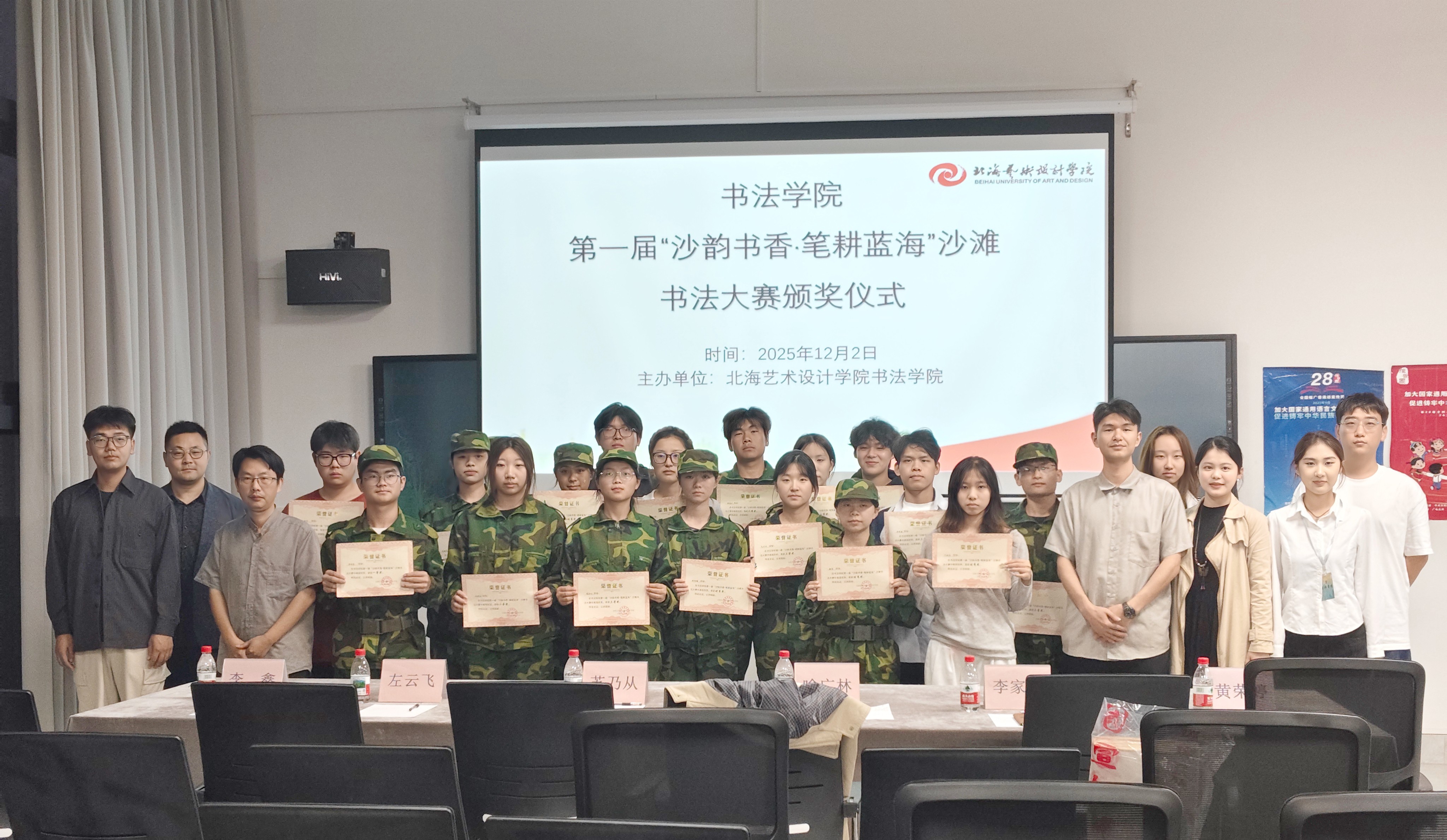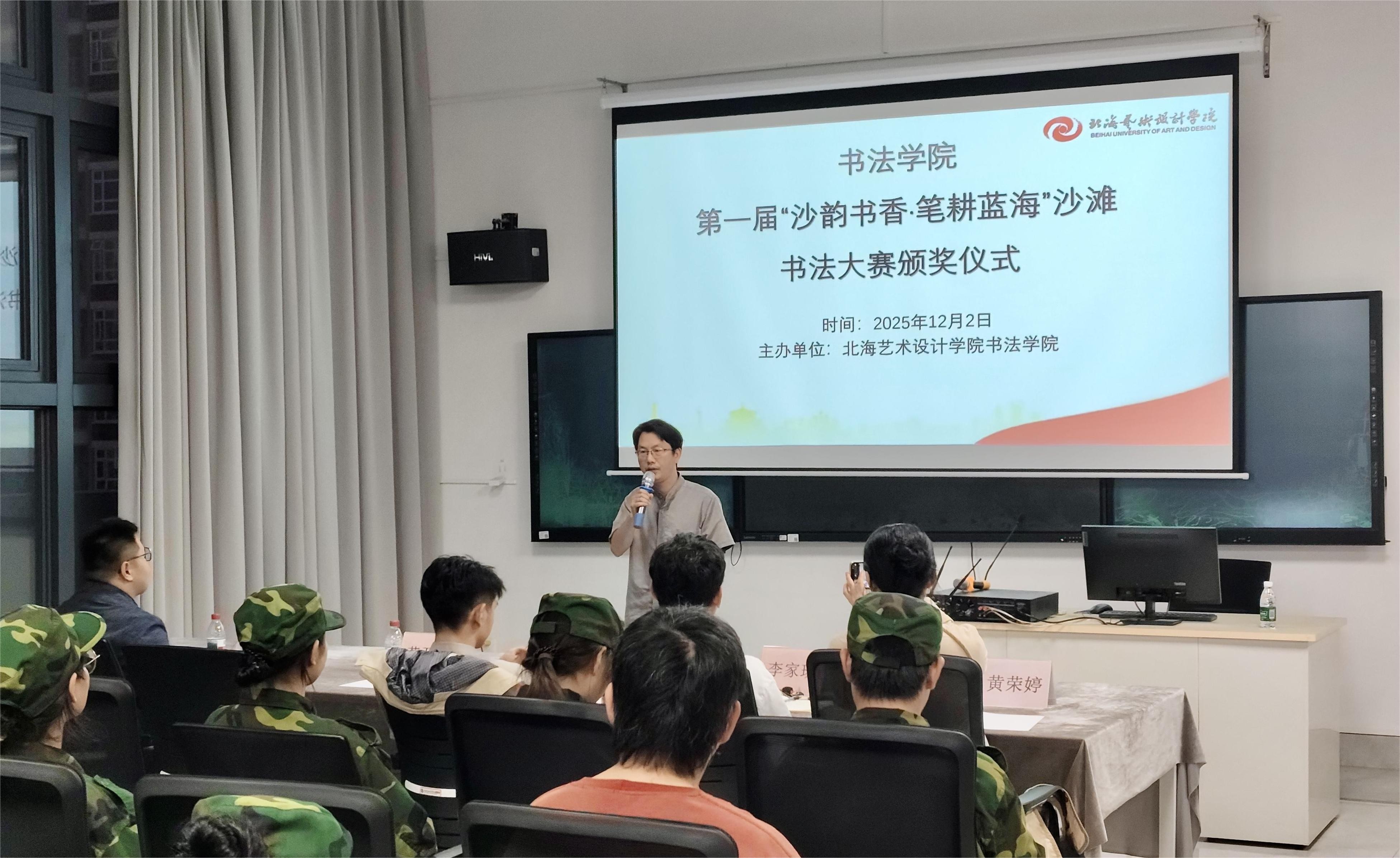 12月2日,颁奖仪式于艺德楼507室举行。书法学院常务副院长苏乃从,党支部书记喻广林、副书记左云飞,副院长李家琪、黄荣婷,书法学教研室主任李鑫出席并为获奖学生颁奖。获奖学生代表孙啸宇、李利合上台分享了创作心得与灵感来源。