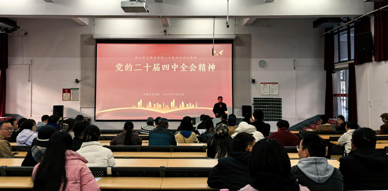 12月26日,学院党总支书记王明森为全院教职工作党的二十届四中全会精神专题辅导报告。报告中,王明森书记紧扣全会核心要义与实践要求,结合学院传媒艺术学科专业特色,系统阐释了全会精神对新时代文化事业发展、艺术创作创新及高素质人才培养的战略指引意义。他强调,全院教师要切实提高政治站位,把全会精神融入课堂教学、艺术创作、科研攻关全过程,深化专业教育与思政教育融合育人,以高质量教育教学成果为学校谋划推进“十五五”规划、实现内涵式发展筑牢思想根基、凝聚奋进力量。