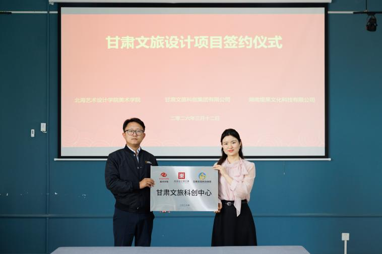 2026年3月12日,美术学院与甘肃文旅科创集团签署合作协议,并举行“甘肃文旅科创中心”授牌仪式。签约仪式上,甘肃文旅科创集团负责人向我院授牌,正式成立“甘肃文旅科创中心”。根据协议,双方将建立常态化设计需求对接机制:甘肃文旅科创集团将定期梳理省内文旅场景在视觉形象优化、文化创意衍生、空间艺术提升、数字交互体验等领域的共性需求,形成课题方向发布至美术学院;我院将依托自身在摄影、美术学、绘画、雕塑等学科的优秀师资力量,通过写生采风、毕业设计、专题工作坊等形式开展定向创作与课题研究,为甘肃文旅资源转化提供创意储备。