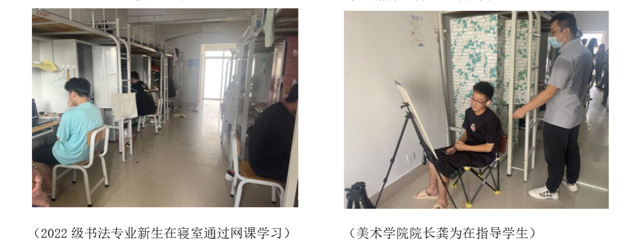 巡查小组首先对艺术楼的雕塑教室、地下摄影棚、绘画教室中正在上课教师和学生听课情况进行了全面检查。美术学院副院长龚为,副院长金凯婧、肖玺,以及各教研室主任在艺术楼与教师亲切交谈,查看教师上课前准备、学生到位情况,深入课堂现场听课,对任课教师的教学及学生上课情况等表示满意。同时,龚为、袁志伟(美术学院实训主任)还对教学环境进行了安全隐患排查,保障教学正常运行。随后检查小组走访部分2022级新生寝室,随机巡查学生网课学习情况,学生学习态度积极,认真听课并能够进行相应的课程练习。
