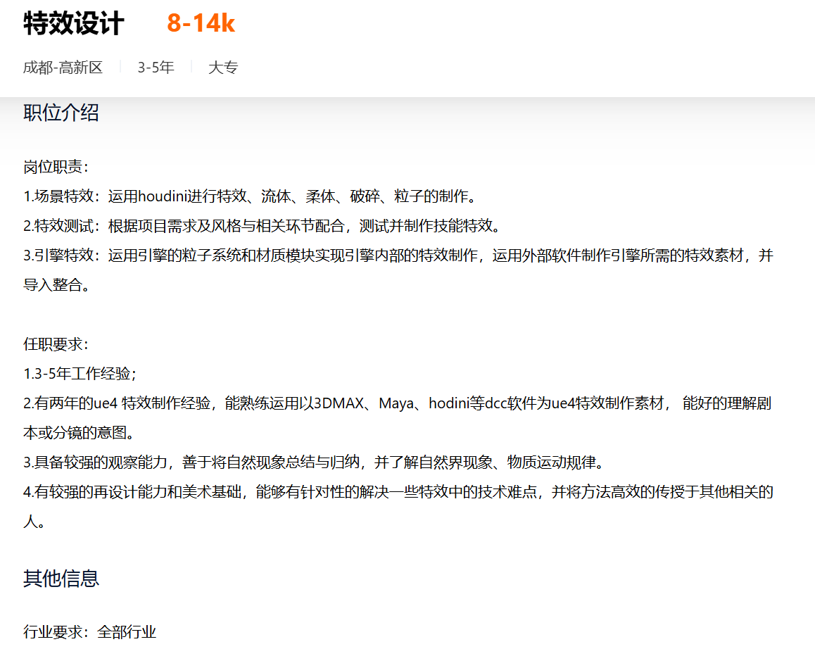 纵观艾尔平方这次招聘不难发现,对3D特效师的需求尤为突出,UE5引擎、实时渲染等技术成为岗位硬性要求。