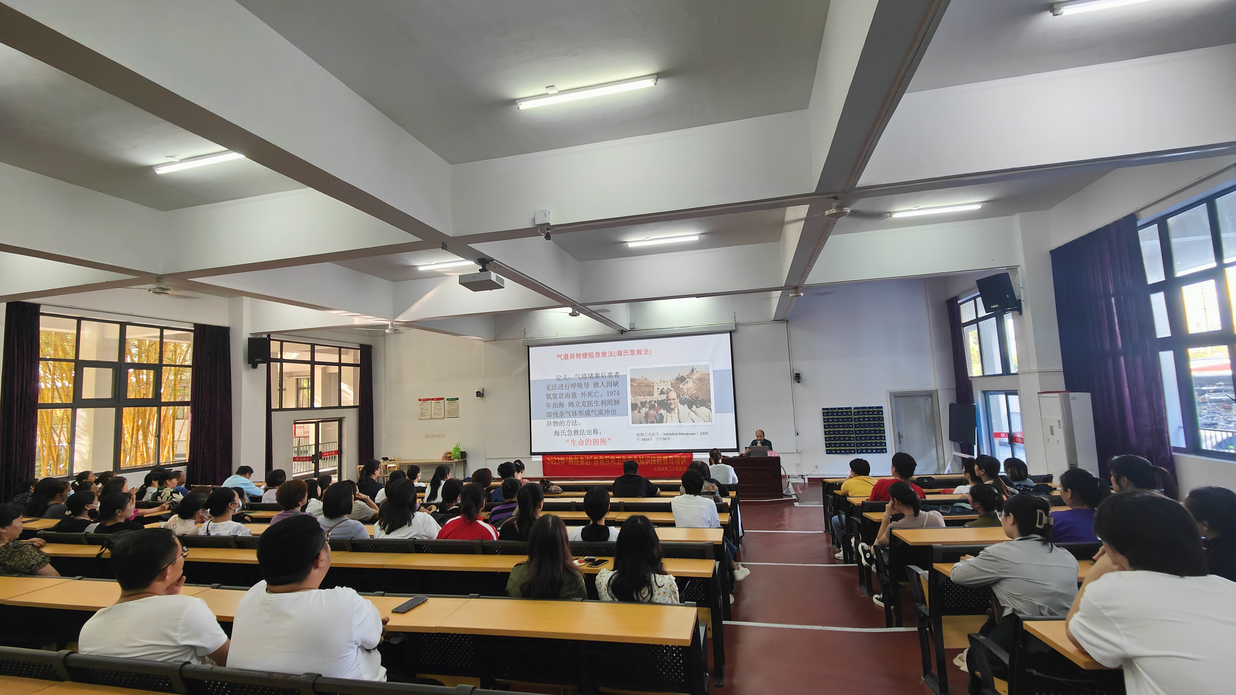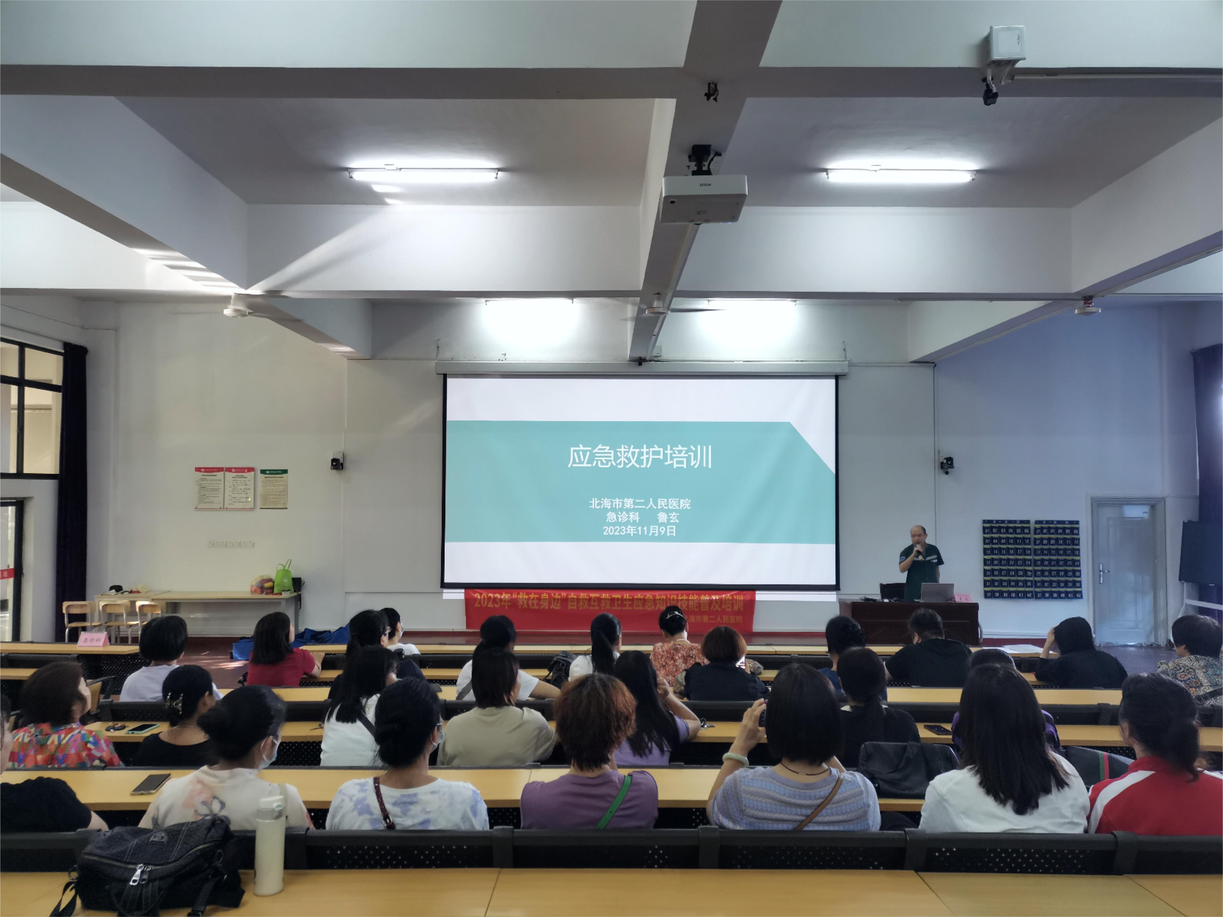 随着现代社会的发展,人们新的生活模式结构下,在生产、学习、生活环境中发生的危重急症、意外伤害愈来愈屡见不鲜,为提高我校教职员工的急救意识与现场急救能力,11月9日下午,我校组织开展自救互救卫生应急知识技能培训。培训由周晓敏老师主持,北海市第二人民医院的鲁玄主任、黄焱医生及蒙春良主管护师分别进行了应急救护知识讲授,并现场演示了心肺复苏术、气道阻塞的现场急救、创伤止血包扎技术及实操指导。通过此次应急救护知识技能培训,加强了我校教职工对急救技能的了解,也为我校应对突发事件,及时、有效开展现场救护积累了经验。
