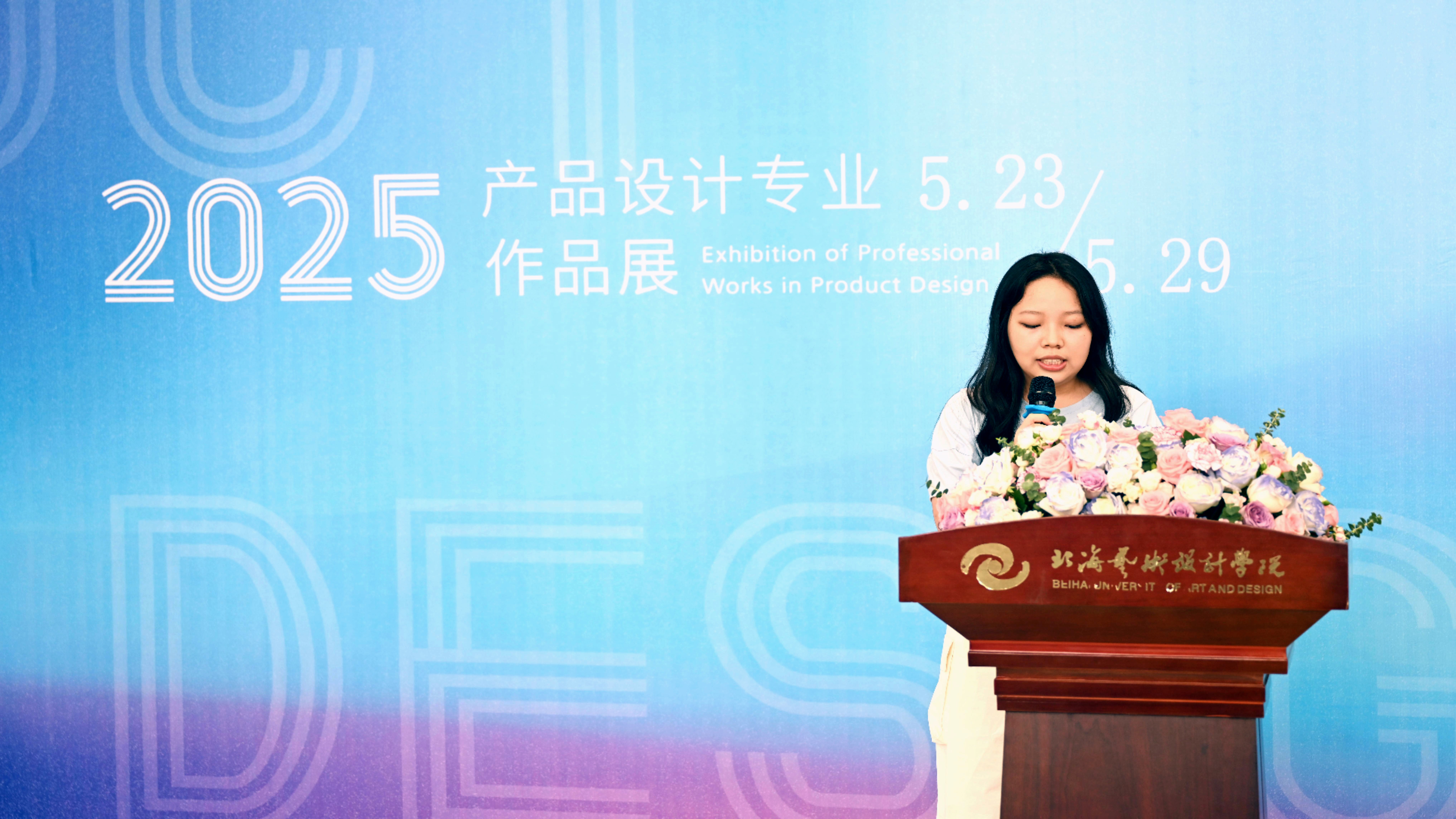 教师代表卢雯芝老师在发言中深情回顾了教学过程中的点滴。她提到,在交互设计、产品创新设计等课程中,学生们大胆拥抱新技术,将用户需求与创新理念相结合,设计出富有时代感的作品而在贝雕、赤江陶等传统工艺课程中,学生们通过非遗工坊的实践,不仅掌握了精湛的技艺,更深刻体会到匠人精神的真谛