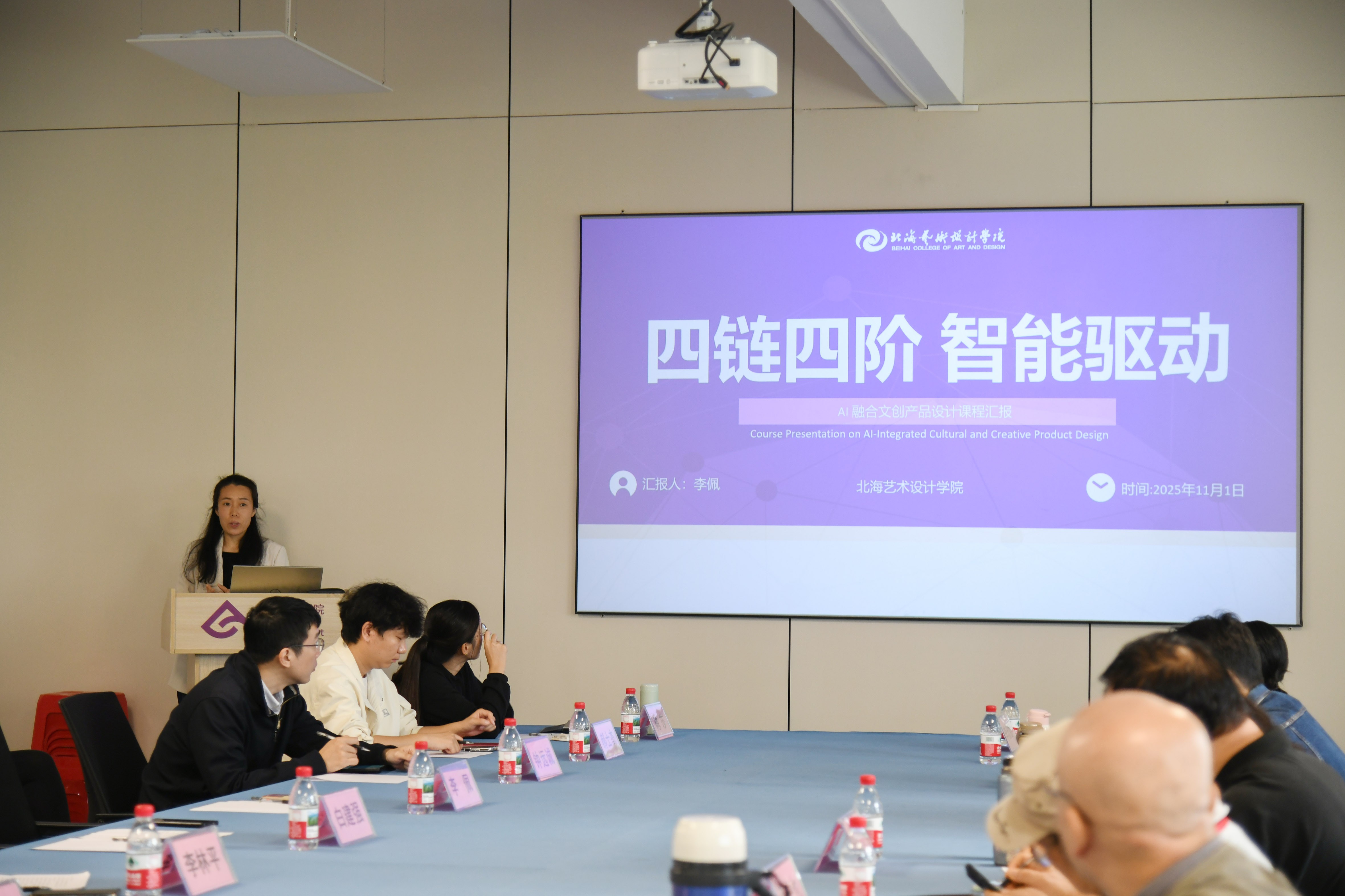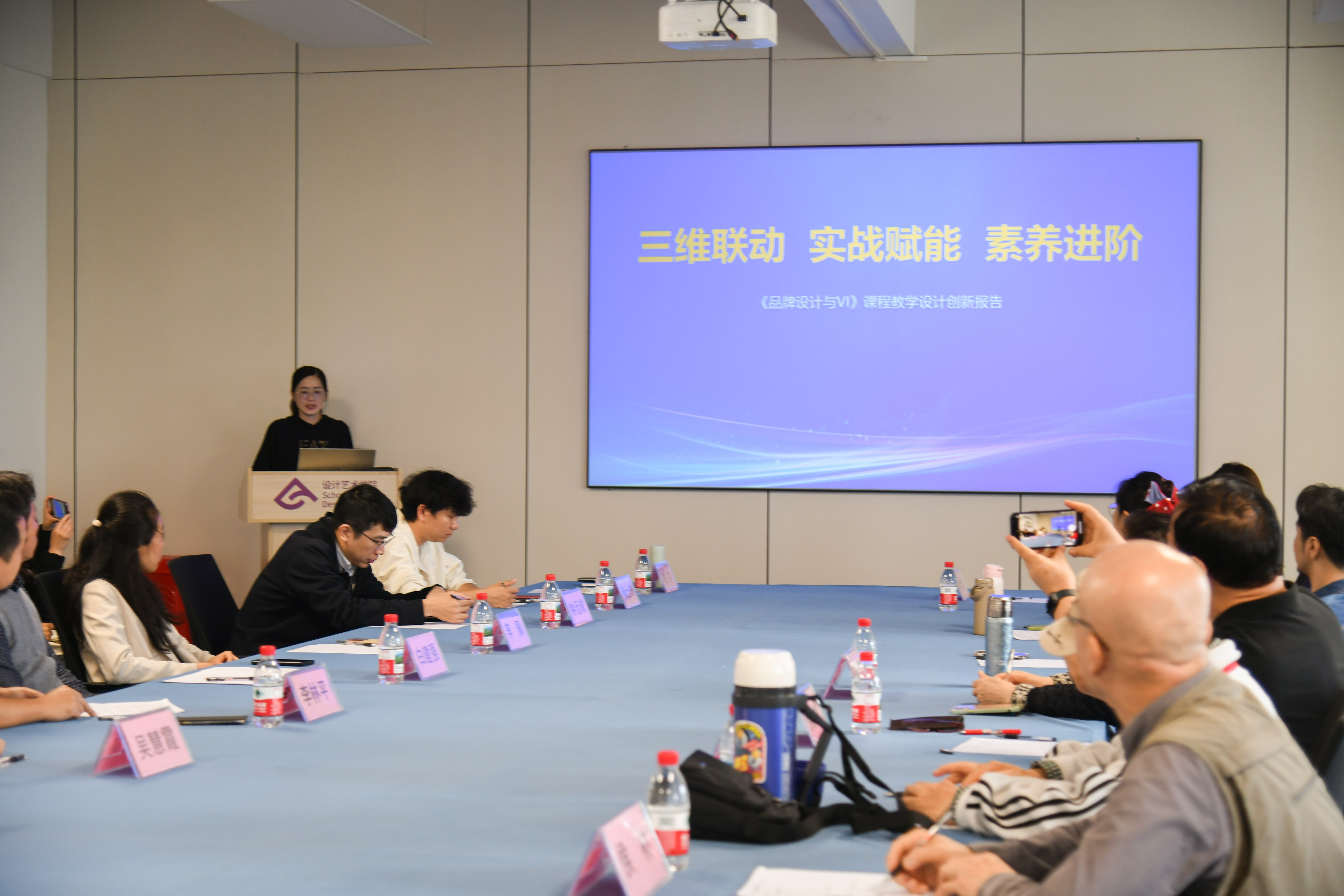 接下来由白建强副院长介绍了学院面对AI浪潮,通过强化艺科融合在专业人才培养方案设置上所做的积极调整以及课程建设上取得的成果。随后,吴慧霞副院长分享了以《一核心、二融合、三驱动、四维递进教学模式》为题,阐述了《广告设计》课程教学创新的具体举措;李佩副院长以《四链四 阶智能驱动》为题,汇报了AI如何系统性赋能《文创产品设计》课程;陈莎老师以《三维联动 实战赋能 素养进阶》为题,阐述了《品牌设计与VI》课程的教学改革思路与成果;李欣颐老师则以《人文科技双融驱动下“三维、三阶、三位“》为题,围绕《字体设计》课程介绍AI数智技术在课程各教学环节中的融合应用案例。这些汇报从不同专业角度,生动呈现了学院教师在AI教学应用前沿的积极探索。