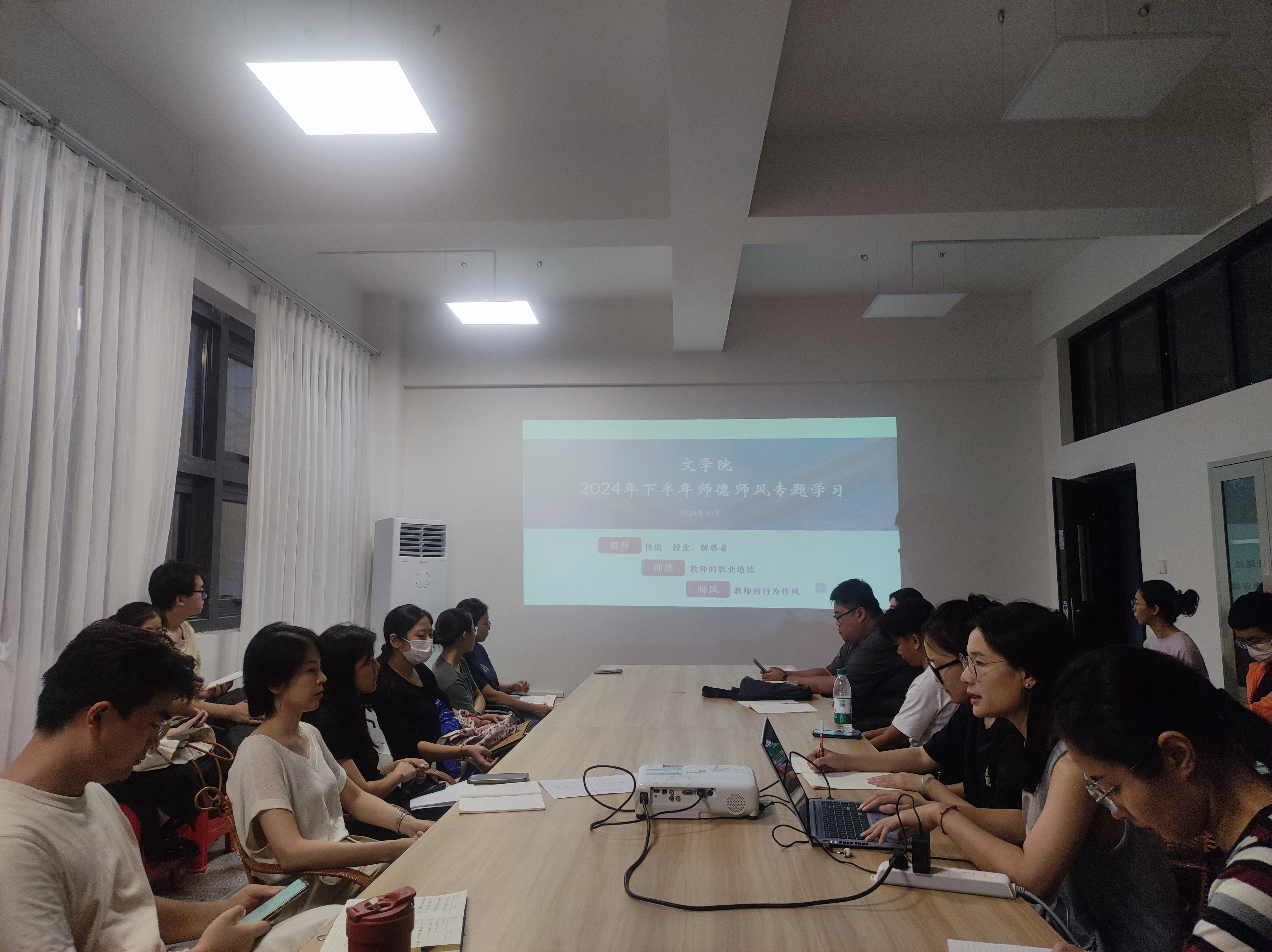 深入学习贯彻习近平新时代中国特色社会主义思想,贯通学习习近平总书记在全国教育大会上的重要讲话和指示批示精神,坚决落实师德师风第一标准,进一步加强我院教师师德师风建设,牢固树立“立德树人”观念,2024年10月22日下午,文学院于南区体育馆一楼会议室召开了2024年下半年师德师风专题学习会。本次会议由岳莹书记主持,学院全体教职员工参加。