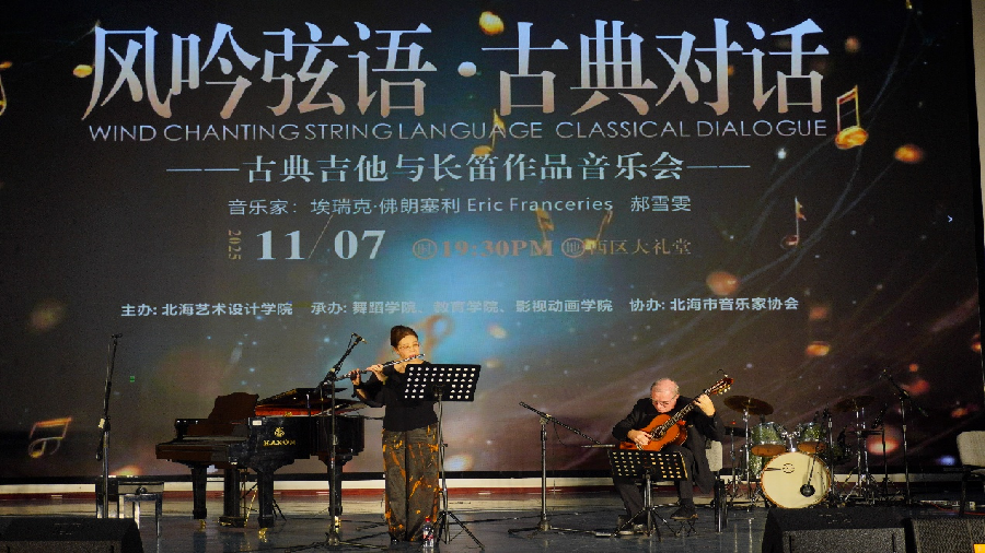 由北海艺术设计学院主办,学校舞蹈学院、教育学院及影视动画学院联合承办,北海市音乐家协会协办的“风吟弦语・古典对话”古典音乐盛宴,于11月7日在我校西校区大礼堂举行。法国古典吉他演奏家埃瑞克・佛朗塞利与旅法长笛演奏家郝雪雯联袂登台,学校常务副校长胡胜、副校长邱杰、总督学王斌,师生代表及社会各界嘉宾齐聚现场,沉浸式领略这场兼具专业深度与艺术感染力的听觉盛宴。